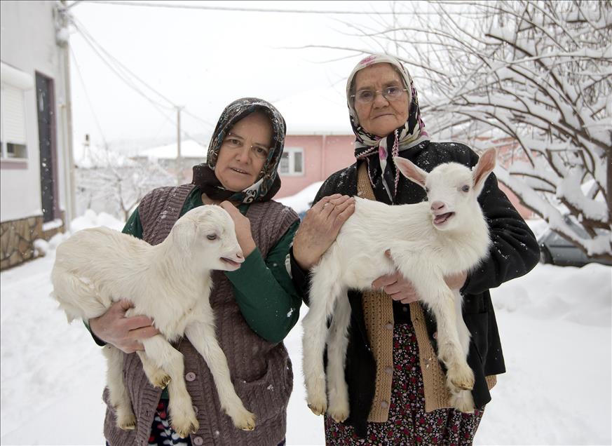 IZMIR, TURKEY - JANUARY 10: Women hold their lambs on their arms on a snow covered area after a day long heavy snowfall in Izmir, Turkey on January 10, 2017.