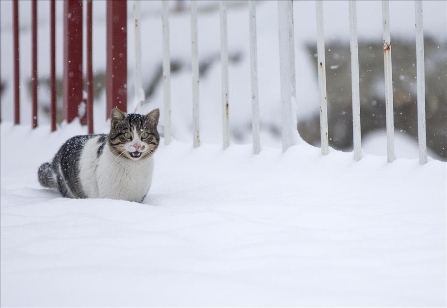 IZMIR, TURKEY - JANUARY 10: A stray cat walks on a snow covered area after a day long heavy snowfall in Izmir, Turkey on January 10, 2017. ( Mahmut Serdar Alakuş - Anadolu Agency )Mahmut Serdar Alakuş