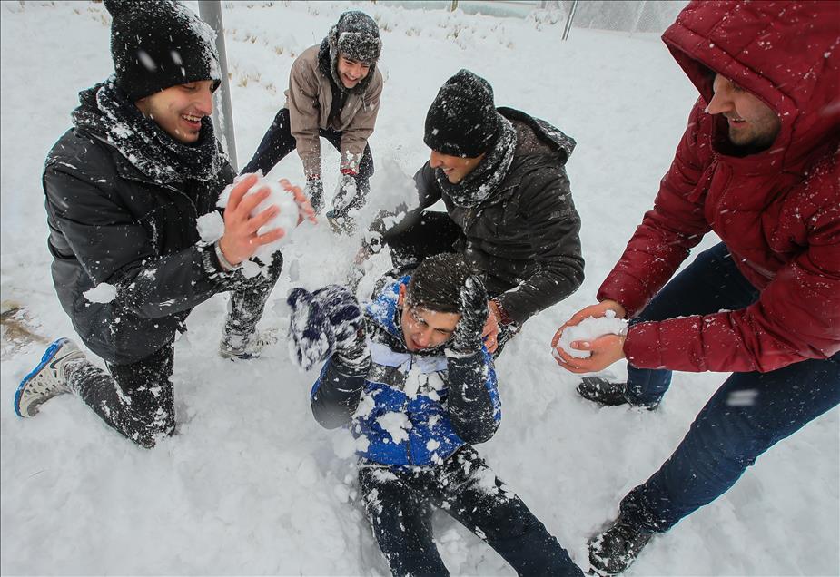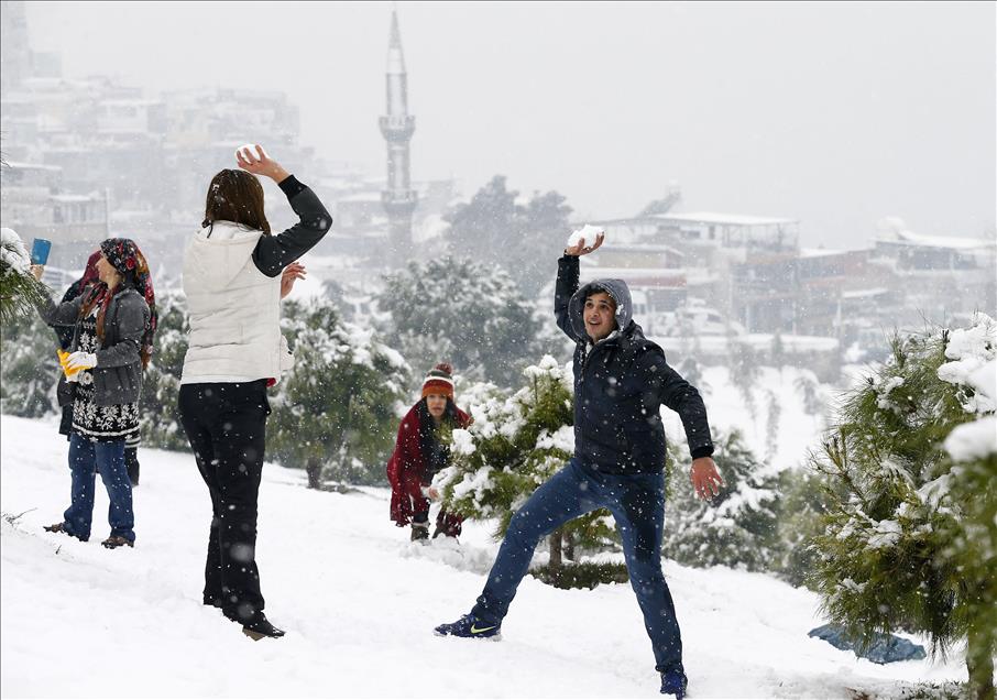 IZMIR, TURKEY - JANUARY 10 : People enjoy the snow as they play snowball during snowfall in Kadifekale district of Izmir, Turkey on January 10, 2017. ( Cem Öksüz - Anadolu Agency )Cem Öksüz