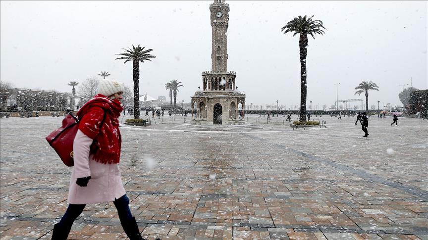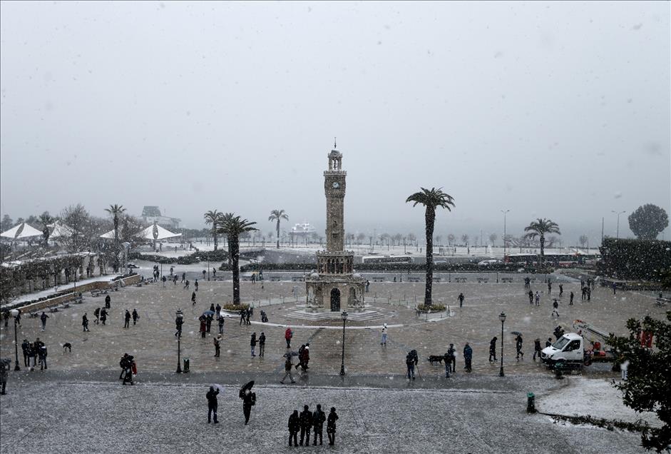IZMIR, TURKEY - JANUARY 10: People walk past the Historical clock tower during the snowfall at Konak Square in Izmir, Turkey on January 10, 2017. ( Mahmut Serdar Alakuş - Anadolu Agency )Mahmut Serdar Alakuş