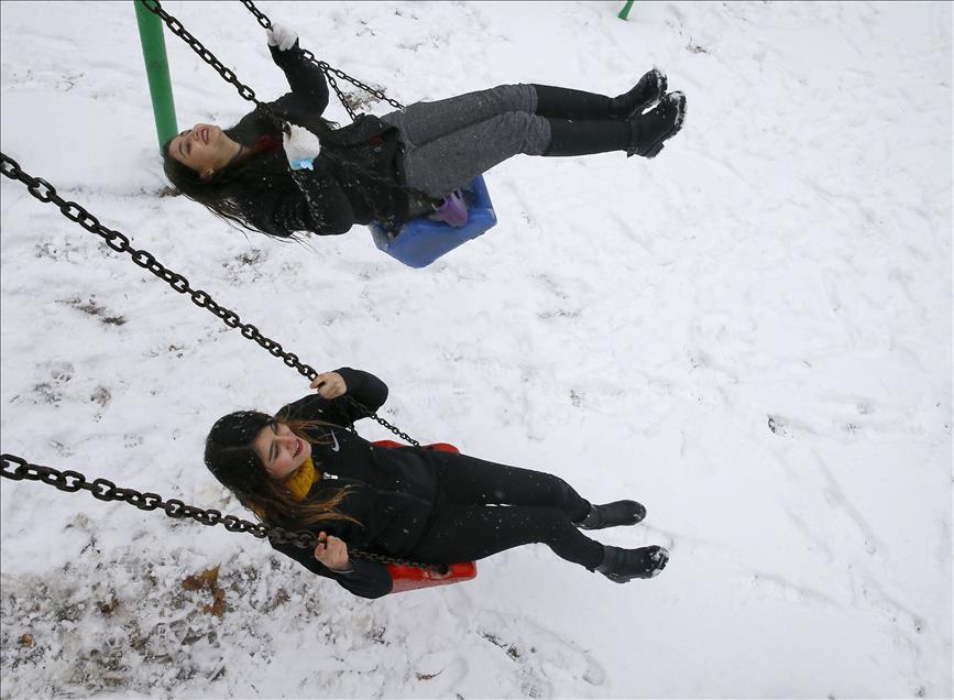 IZMIR, TURKEY - JANUARY 10 : Women enjoy the snow as they swing on a swing during snowfall in Kadifekale district of Izmir, Turkey on January 10, 2017. ( Cem Öksüz - Anadolu Agency )Cem Öksüz