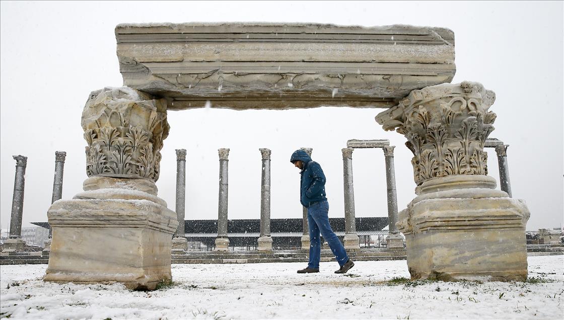 IZMIR, TURKEY - JANUARY 10 : A man walks on snow covered path during snowfall at Agora ancient city in Izmir, Turkey on January 10, 2017. ( Cem Öksüz - Anadolu Agency )Cem Öksüz