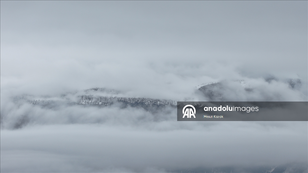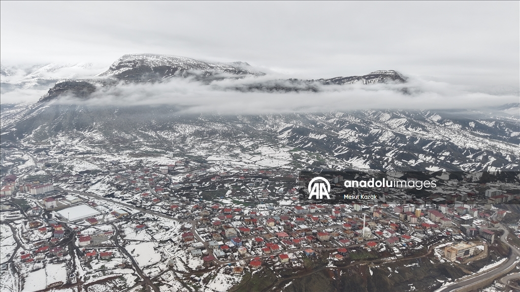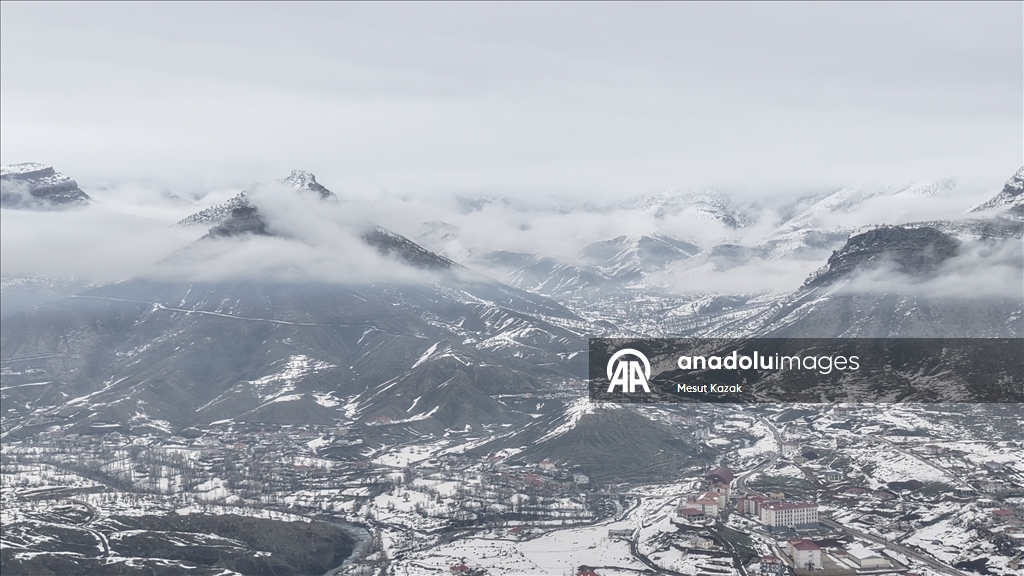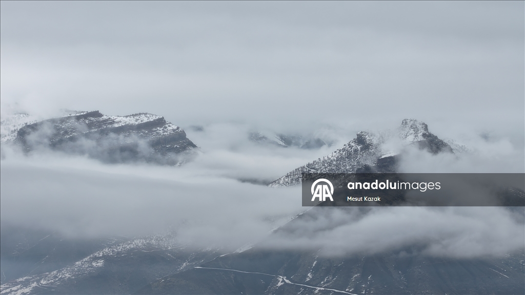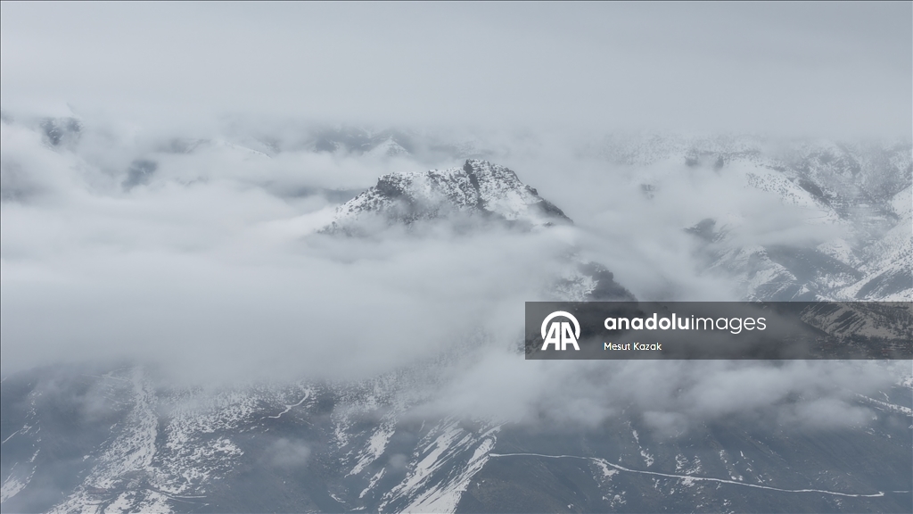 An aerial view shows waterfalls flowing again after melting snow and a layer of fog covering higher elevations in the Derecik district of Hakkari, Turkiye