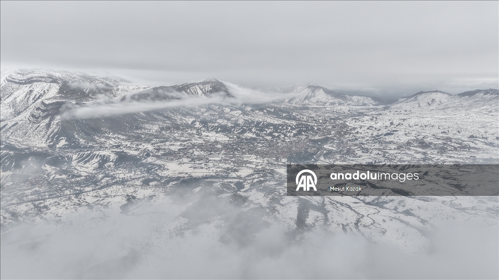 HAKKARI, TURKIYE - FEBRUARY 8: An aerial view shows waterfalls flowing again after melting snow and a layer of fog covering higher elevations in the Derecik district of Hakkari, Turkiye, on February 8, 2026. ( Mesut Kazak - Anadolu Agency )Mesut Kazak