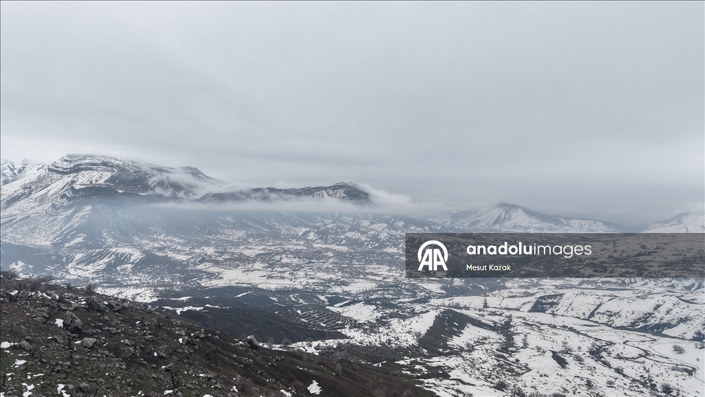 HAKKARI, TURKIYE - FEBRUARY 8: An aerial view shows waterfalls flowing again after melting snow while a layer of fog covers higher elevations in the Derecik district of Hakkari, Turkiye, on February 8, 2026. ( Mesut Kazak - Anadolu Agency )Mesut Kazak