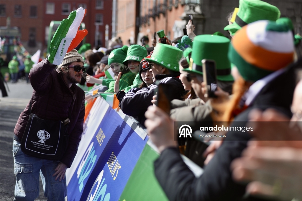 DUBLIN, IRELAND - MARCH 17: Thousands of spectators watch the St. Patrick’s Day parade, featuring over 3,000 participants and 12 large-scale floats from renowned pageant makers, including Macnas and Spraoi in Dublin, Ireland, on March 17, 2026. The 2026 procession, themed around celebrating people and roots, began at Parnell Square and concluded at Kevin Street. Grand Marshal Vogue Williams led the festivities as marching bands from Scotland and eight U.S. states performed. ( Mostafa Darwish - Anadolu Agency )Mostafa Darwish