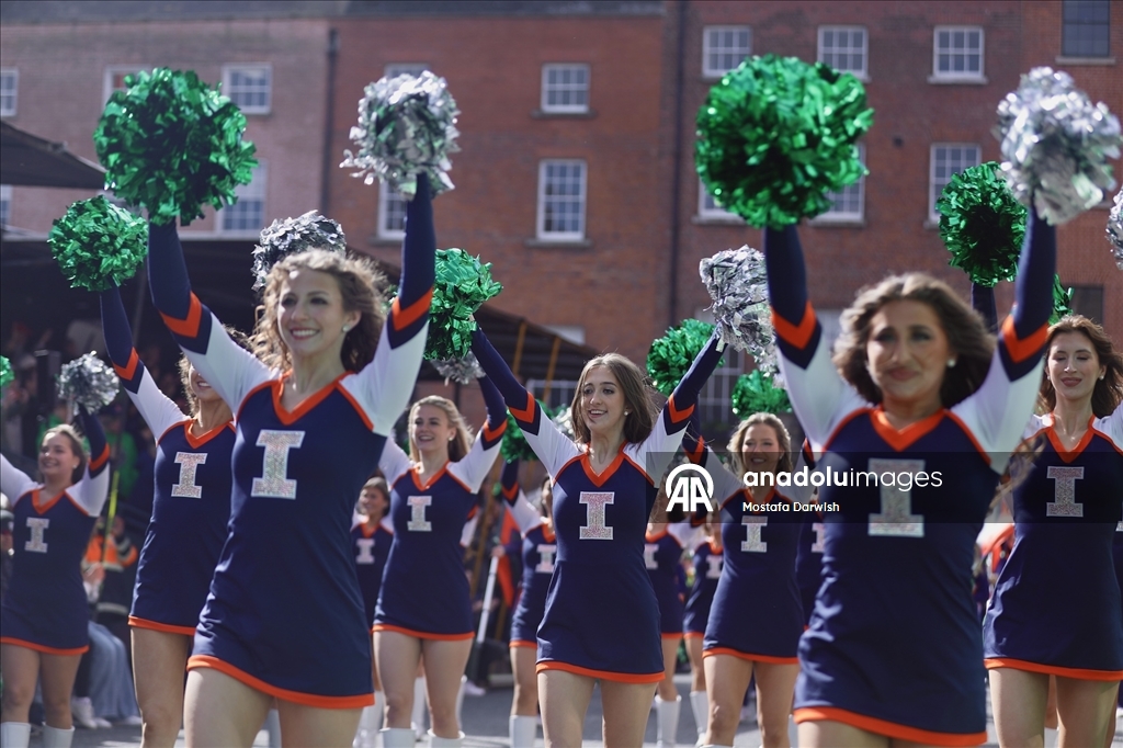 DUBLIN, IRELAND - MARCH 17: People perform dances and music during the St. Patrick’s Day parade, featuring over 3,000 participants and 12 large-scale floats from renowned pageant makers, including Macnas and Spraoi in Dublin, Ireland, on March 17, 2026. The 2026 procession, themed around celebrating people and roots, began at Parnell Square and concluded at Kevin Street. Grand Marshal Vogue Williams led the festivities as marching bands from Scotland and eight U.S. states performed. ( Mostafa Darwish - Anadolu Agency )Mostafa Darwish