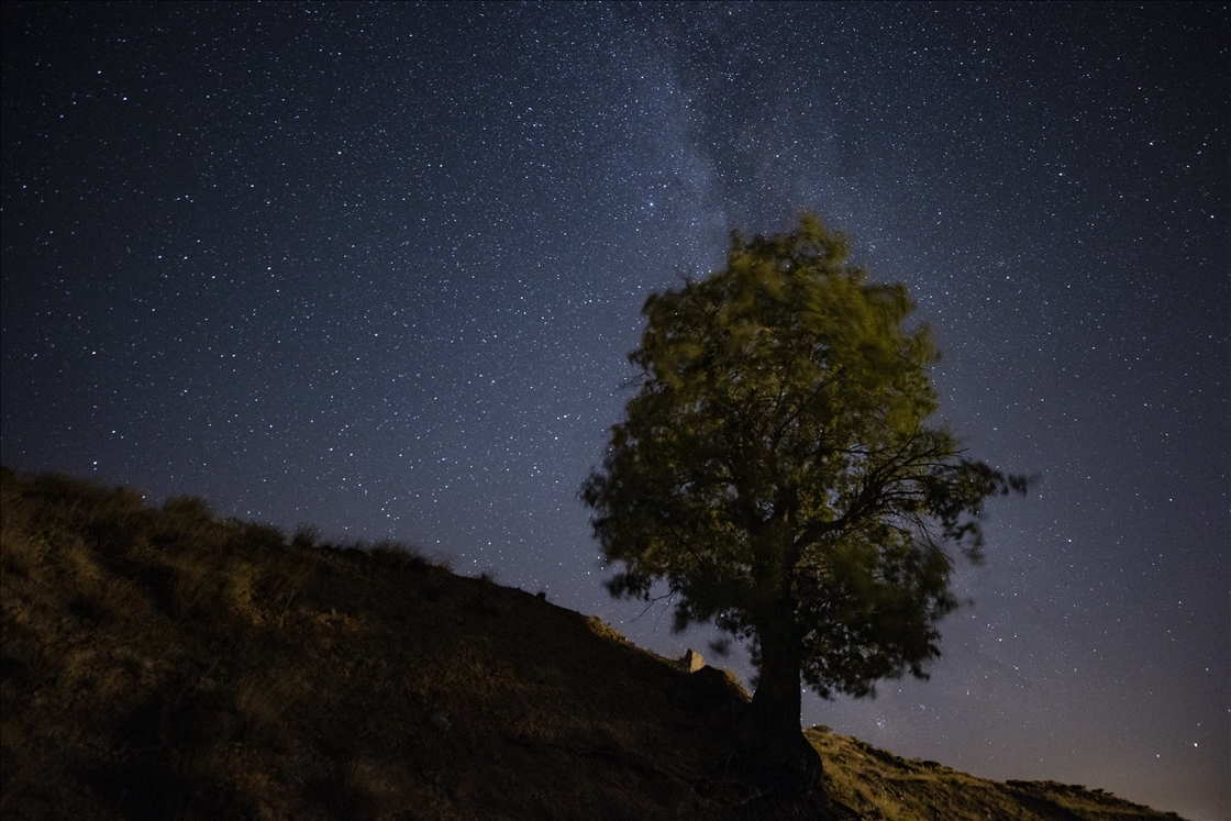 A long exposure photo shows starry night and the Milky Way shining over a tree at an altitude of 2,097 meters on Duzgin Bawo Mountain at Nazimiye district of Tunceli, Turkiye