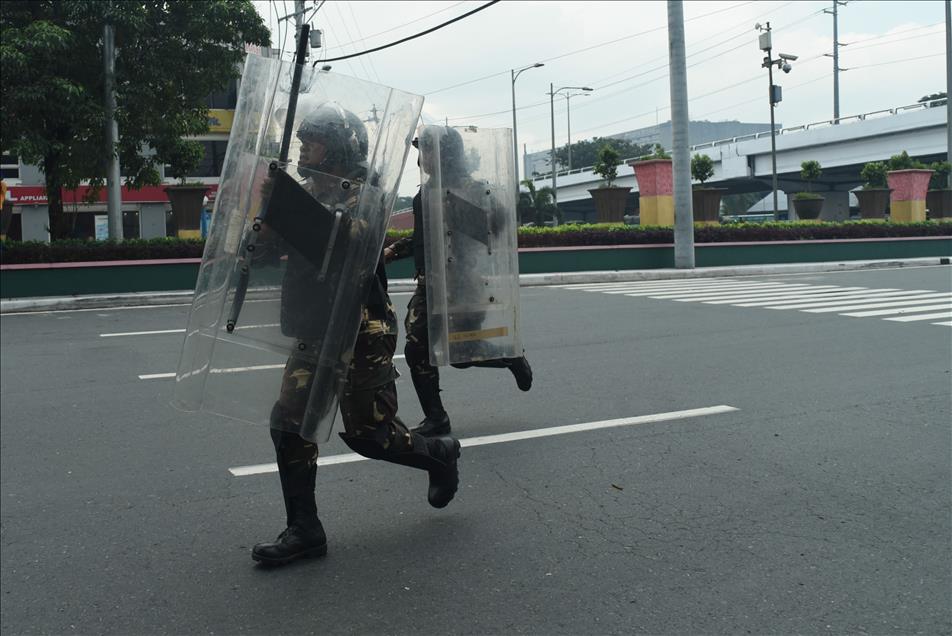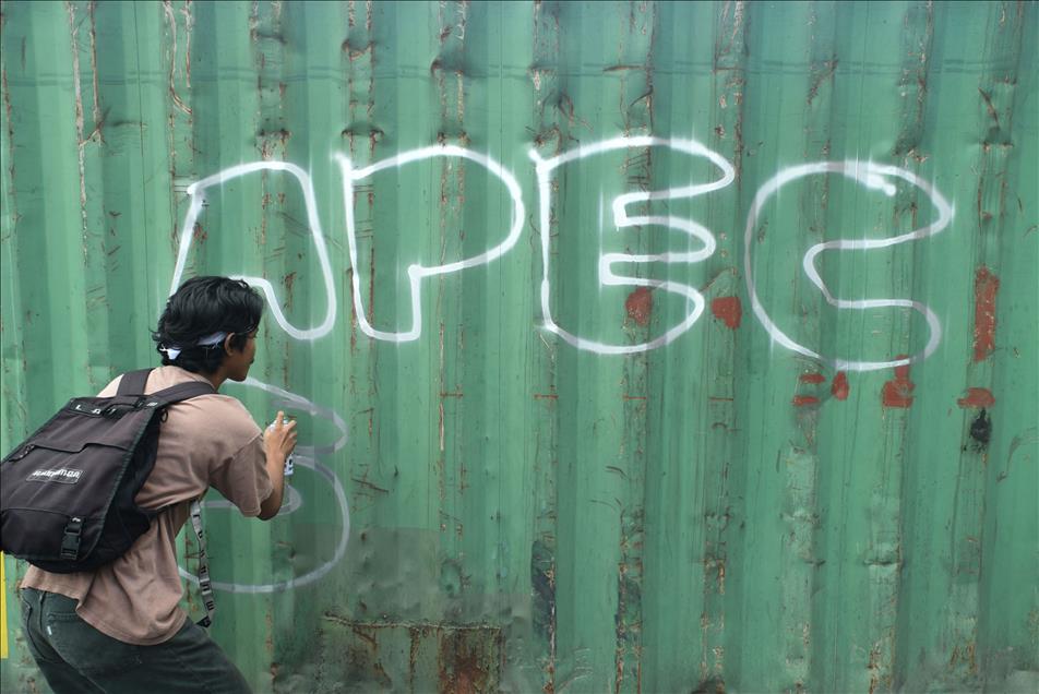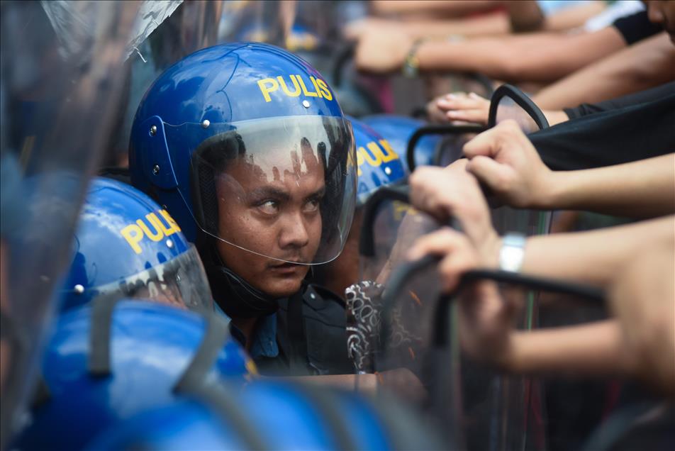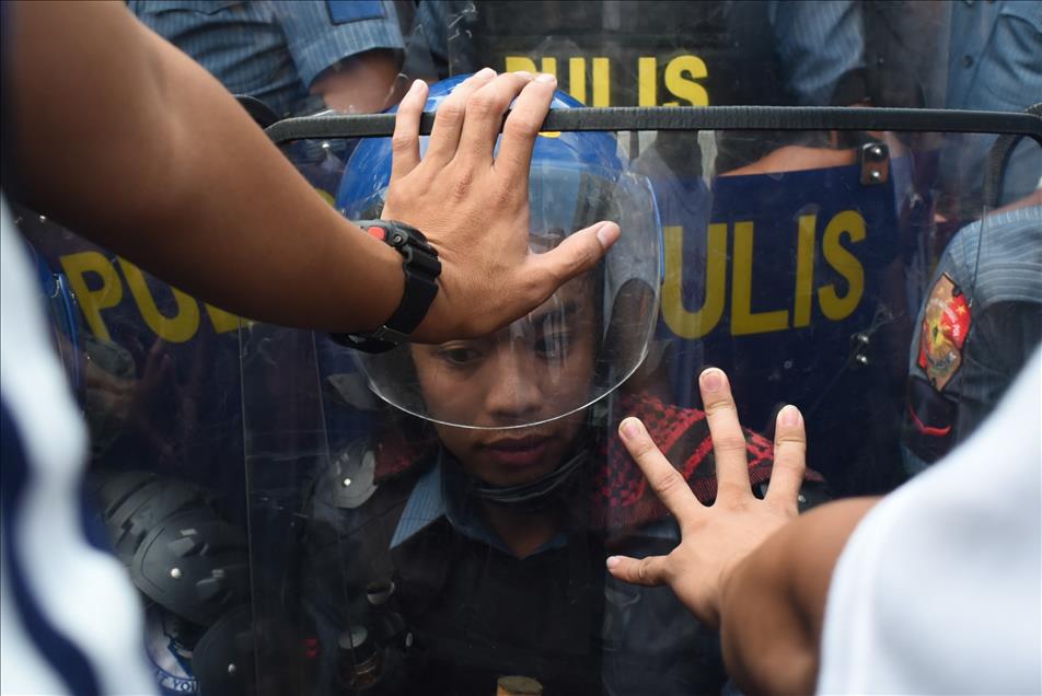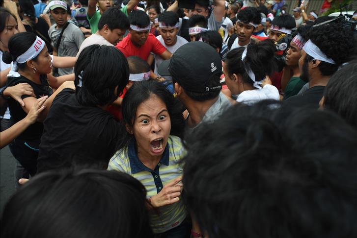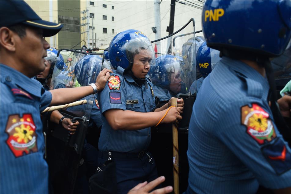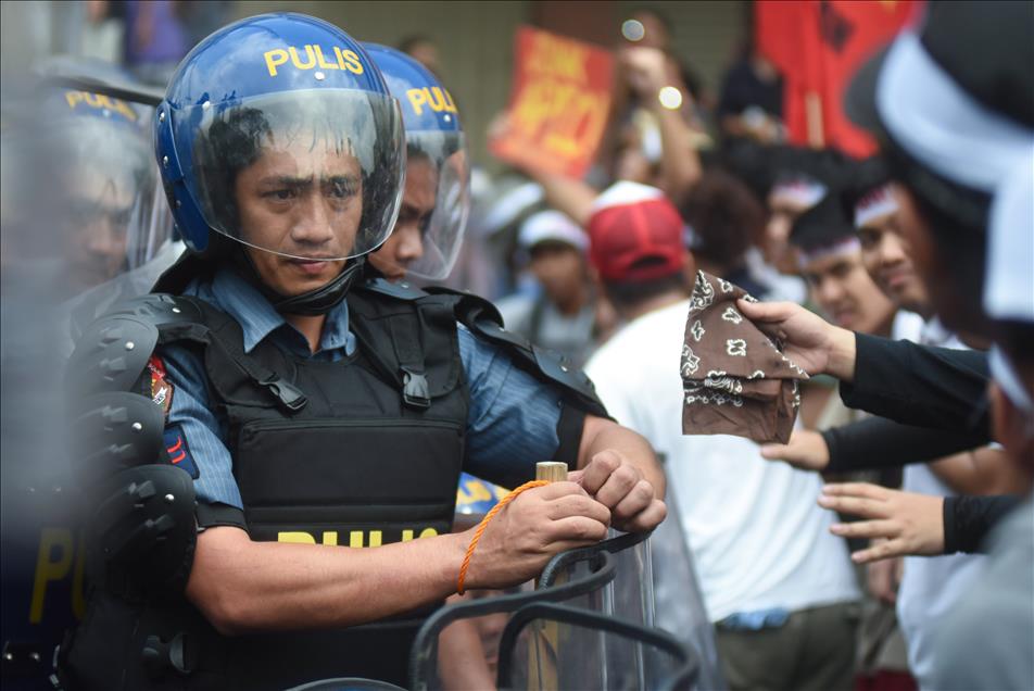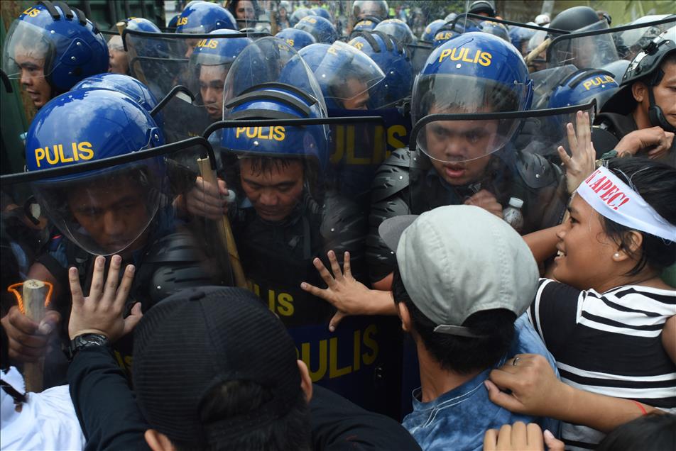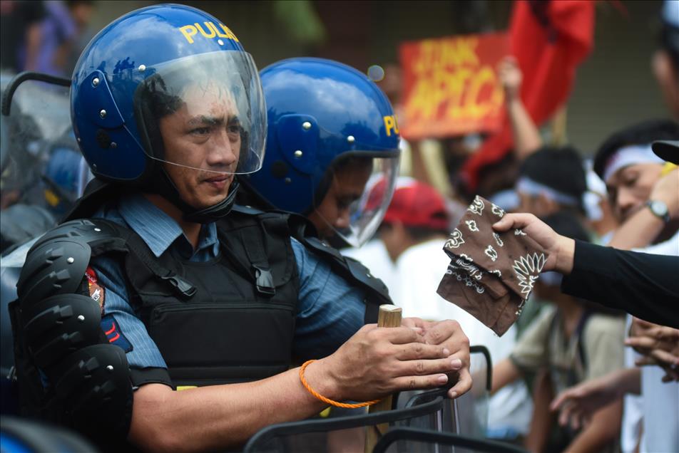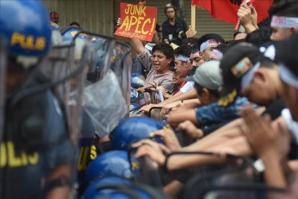 Student group “League of Filipino Students” attempt to march towards the Philippine International Convention Center (PICC), the venue of the Asia Pacific Economic Cooperation (APEC) Summit in Pasay City, 18 November 2015. Heightened security measures are implemented in the capital as leaders of different nations take part in the international conference.