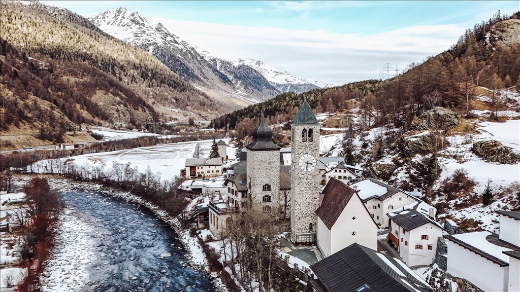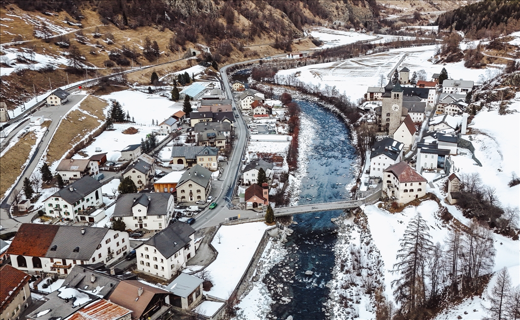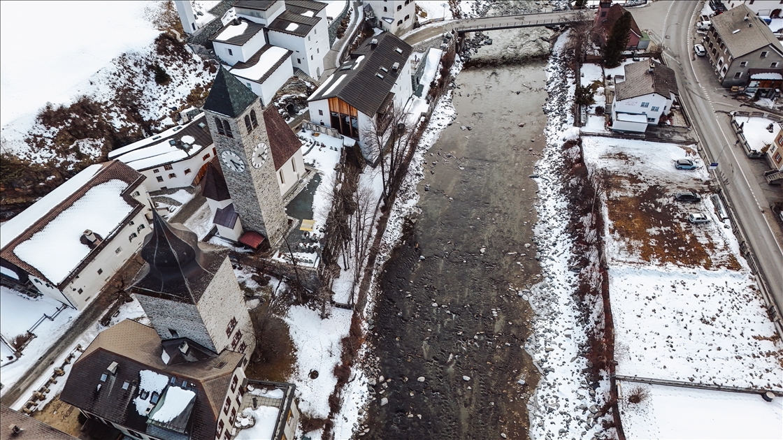 SUSCH, SWITZERLAND - JANUARY 24: An aerial view of the town of Susch, known for its clean mountain air and tranquil atmosphere nestled in the heart of the Swiss Alps, in Switzerland on January 24, 2025. Susch has become a sought-after destination for nature lovers and history enthusiasts with its traditional Swiss architecture. ( Ömer Sercan Karkuş - Anadolu Agency )Ömer Sercan Karkuş