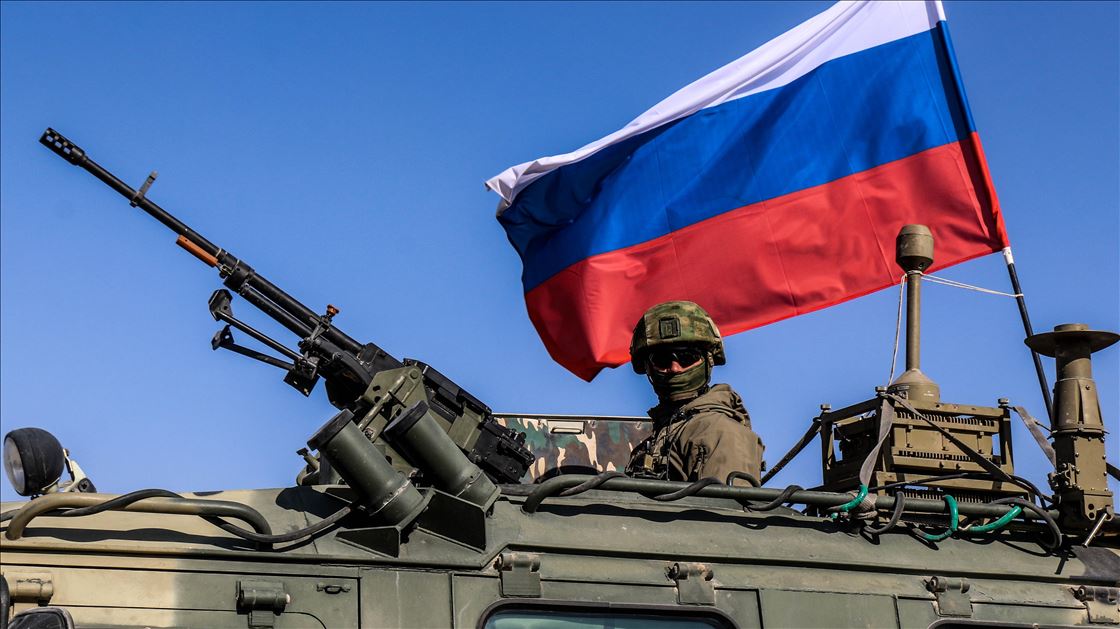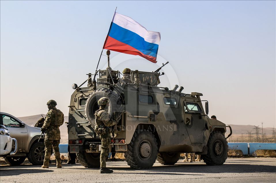 ALEPPO, SYRIA - NOVEMBER 18: Russian soldiers, with Russian flag, are seen near armoured vehicle as they enter the base at the Tishrin Dam on the Euphrates, which the US troops' withdrew from, located 90 kilometres east of Aleppo in Aleppo Governorate, Syria on November 18, 2019. ( Bekir Kasım - Anadolu Agency )Bekir Kasım
