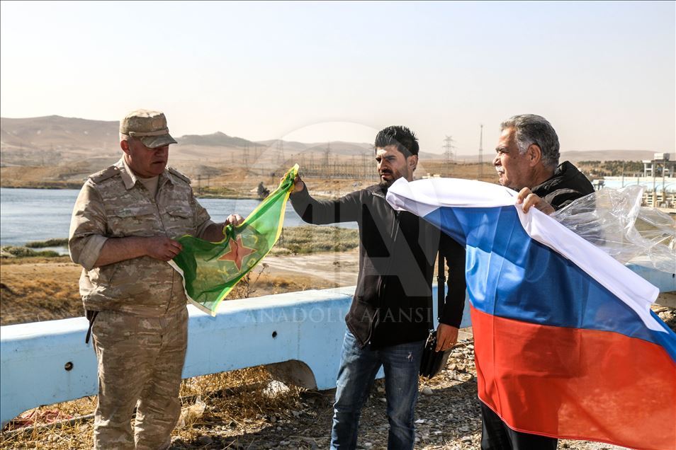 ALEPPO, SYRIA - NOVEMBER 18: A Russian commander (L) and a member of PKK, listed as a terrorist organization by Turkey, the U.S. and the EU, and Syrian Kurdish YPG militia, which Turkey regards as a terror group, Servan Dervish (R) exchange Russian flag and an organization flag after Russian soldiers entered the base at the Tishrin Dam on the Euphrates, which the US troops' withdrew from, located 90 kilometres east of Aleppo in Aleppo Governorate, Syria on November 18, 2019. ( Bekir Kasım - Anadolu Agency )Bekir Kasım