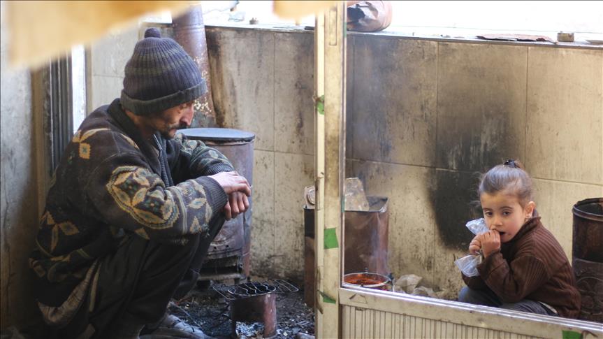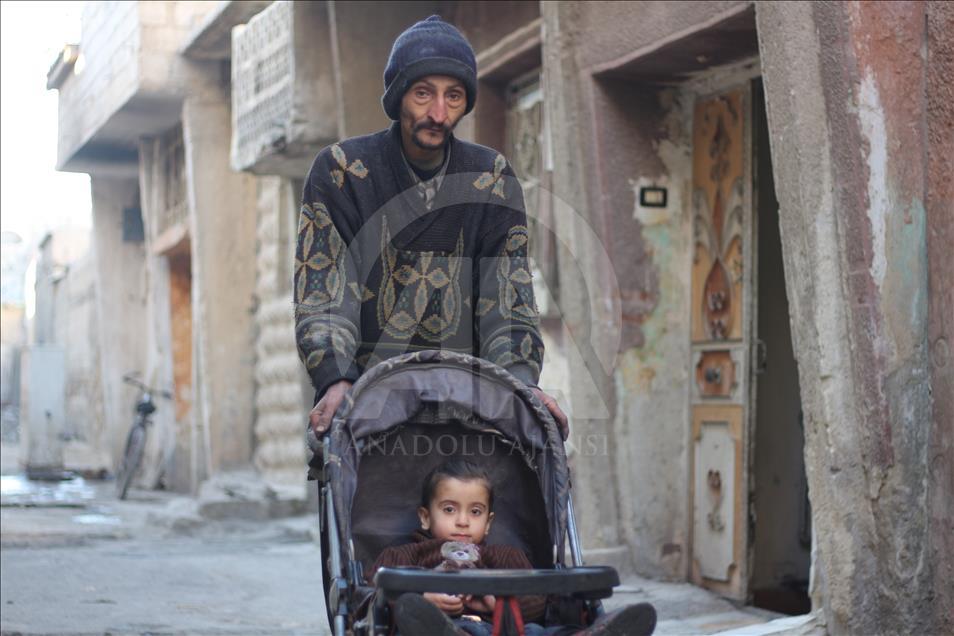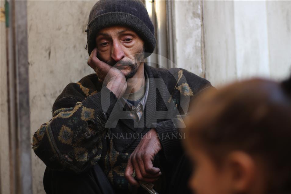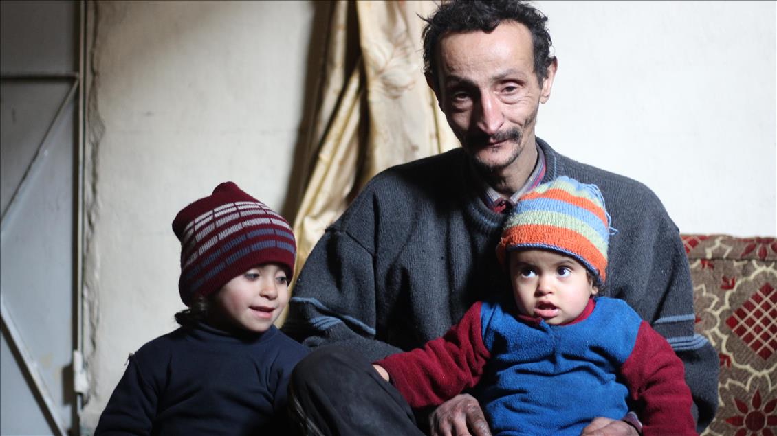 Syrian Abu Qasim, who lost his job due to health issues after Assad Regime's blockage on Easthern Ghouta, sits on the floor as he looks after his daughter in Easthern Ghouta of Damascus, Syria on January 09, 2018. Qasim collects garbage to sell and provide for his family. ( Ammar Sab - Anadolu Agency )Ammar Sab