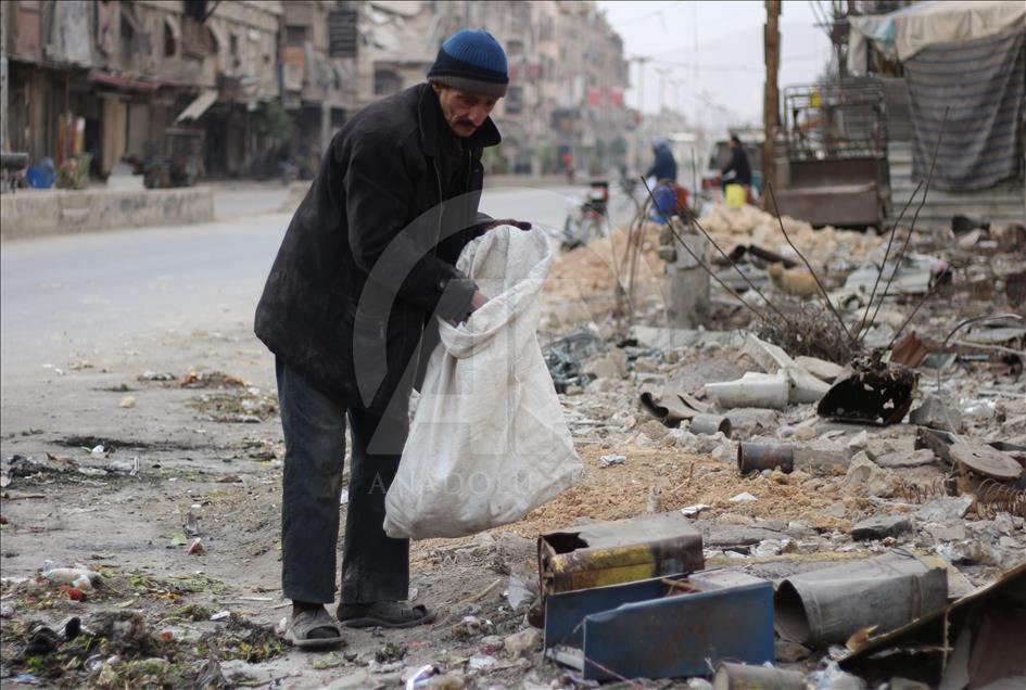 Syrian Abu Qasim, who lost his job due to health issues after Assad Regime's blockage on Easthern Ghouta, collects garbage to sell and provide for his family in Easthern Ghouta of Damascus, Syria on January 09, 2018. ( Ammar Sab - Anadolu Agency )Ammar Sab