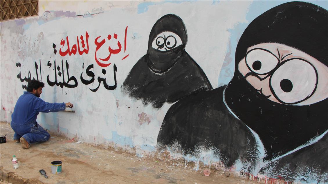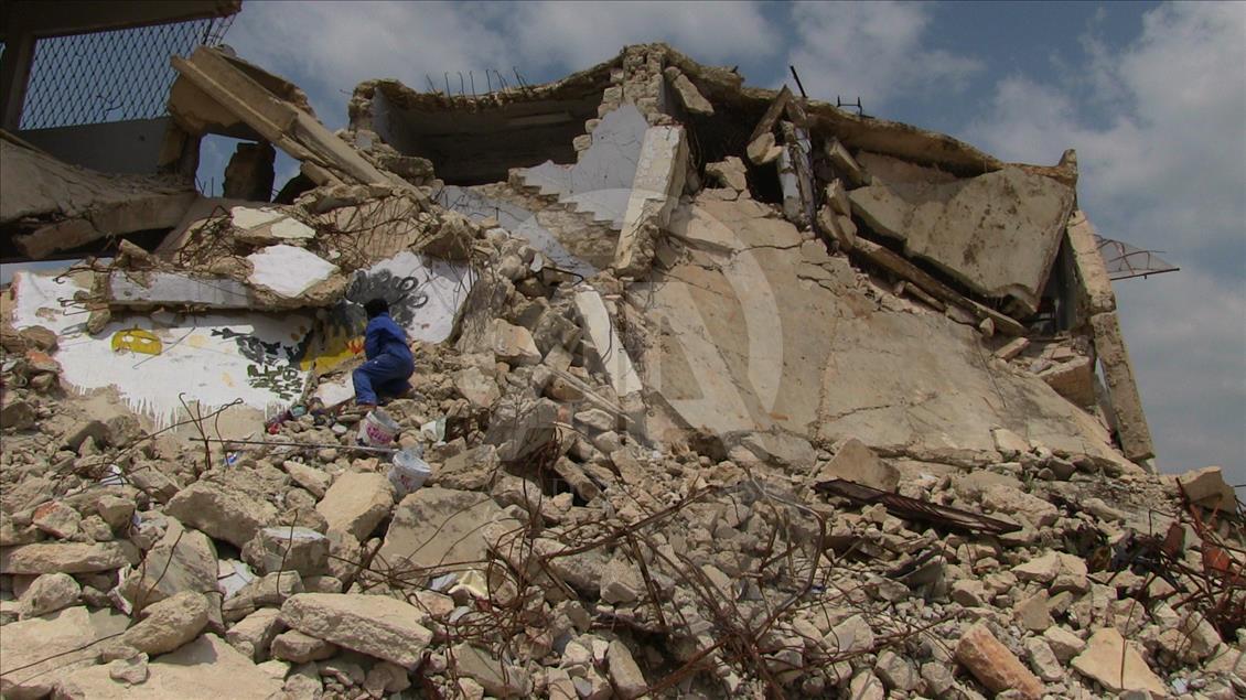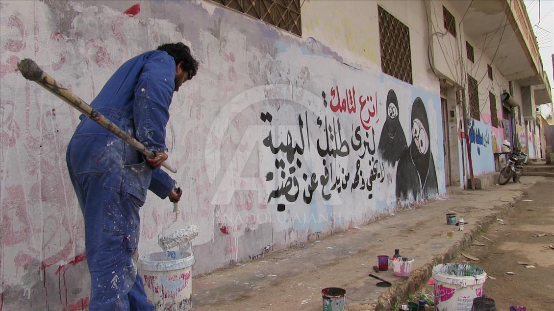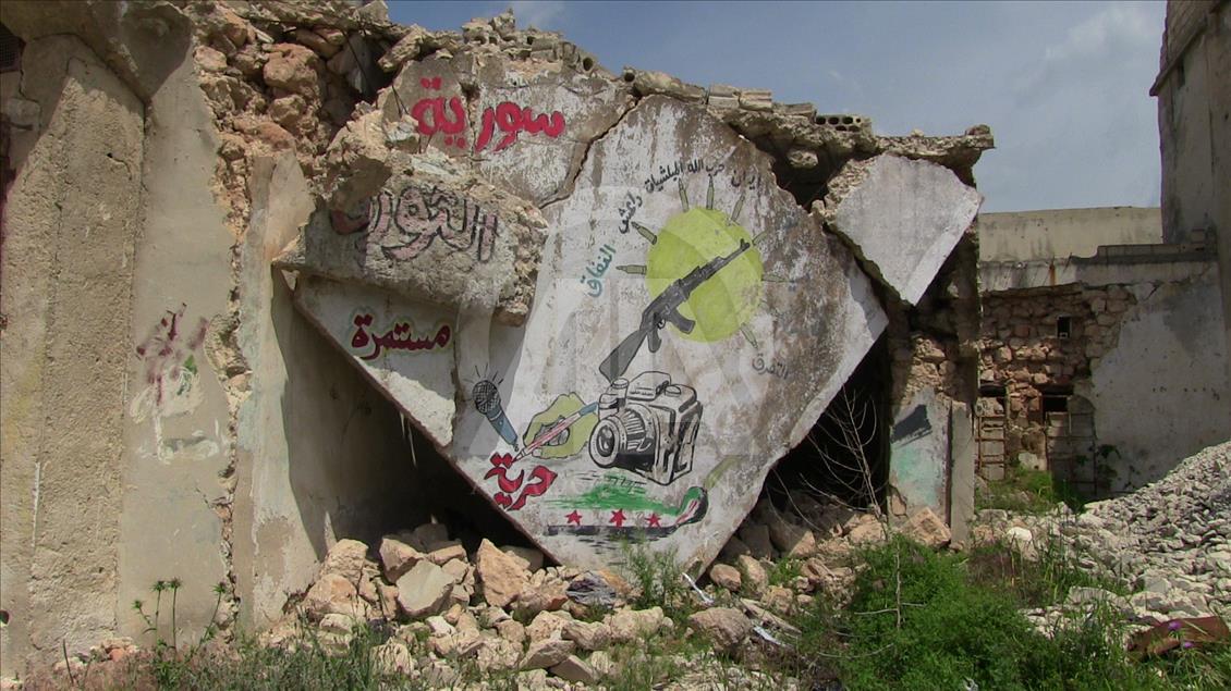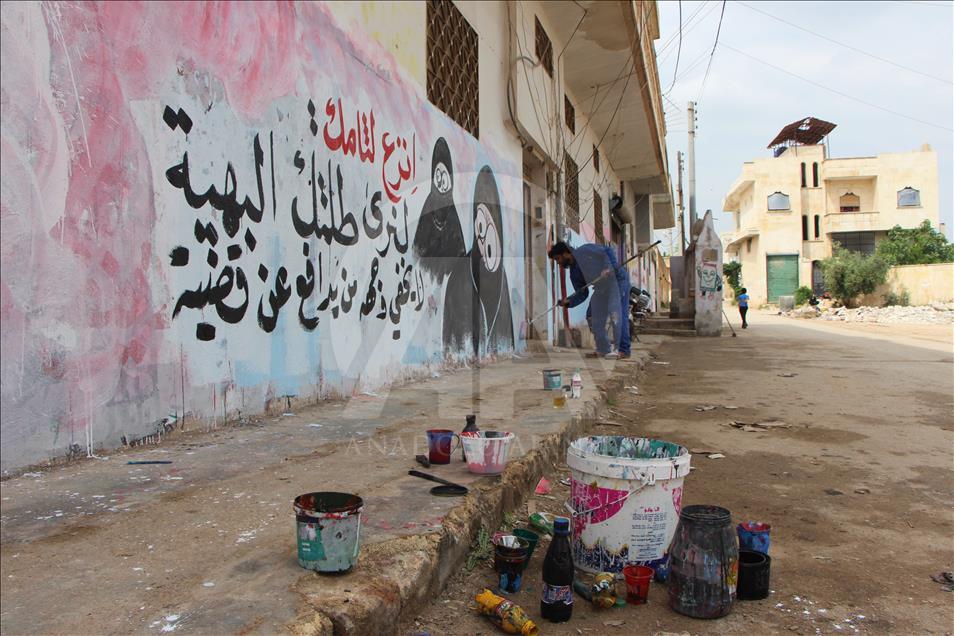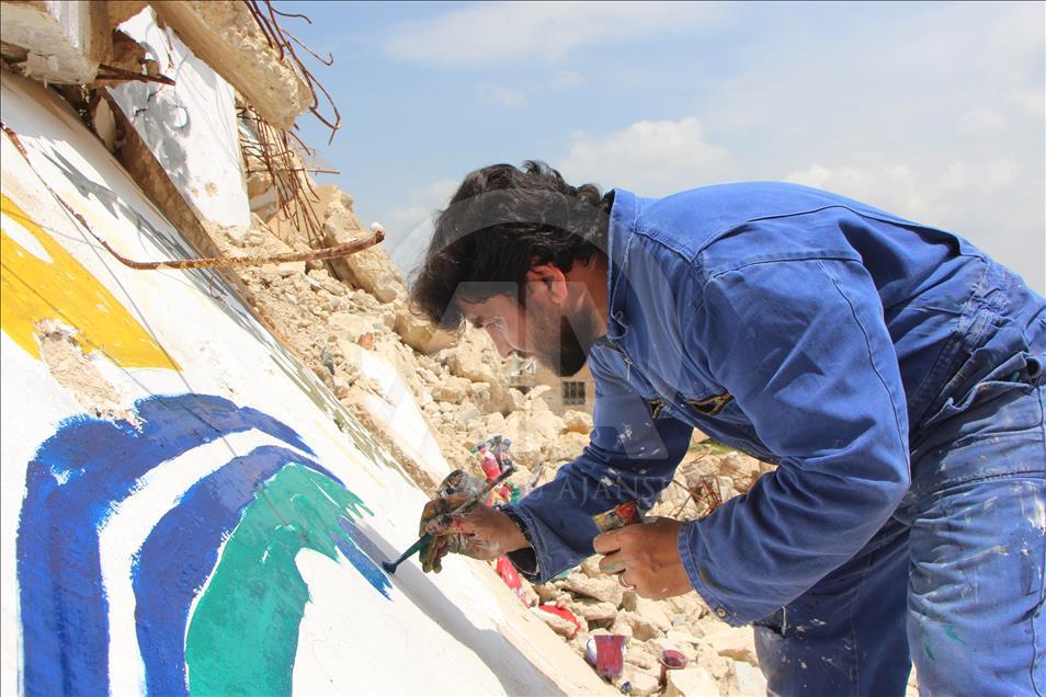 Syrian graffiti artist Aziz al Asmar, 35, paints a wall of a building, which was damaged by Assad regime's airstrikes and assaults, on the subjects of civil war and messages for Islamic world in Binnish district of Idlib, Syria on April 30, 2018.