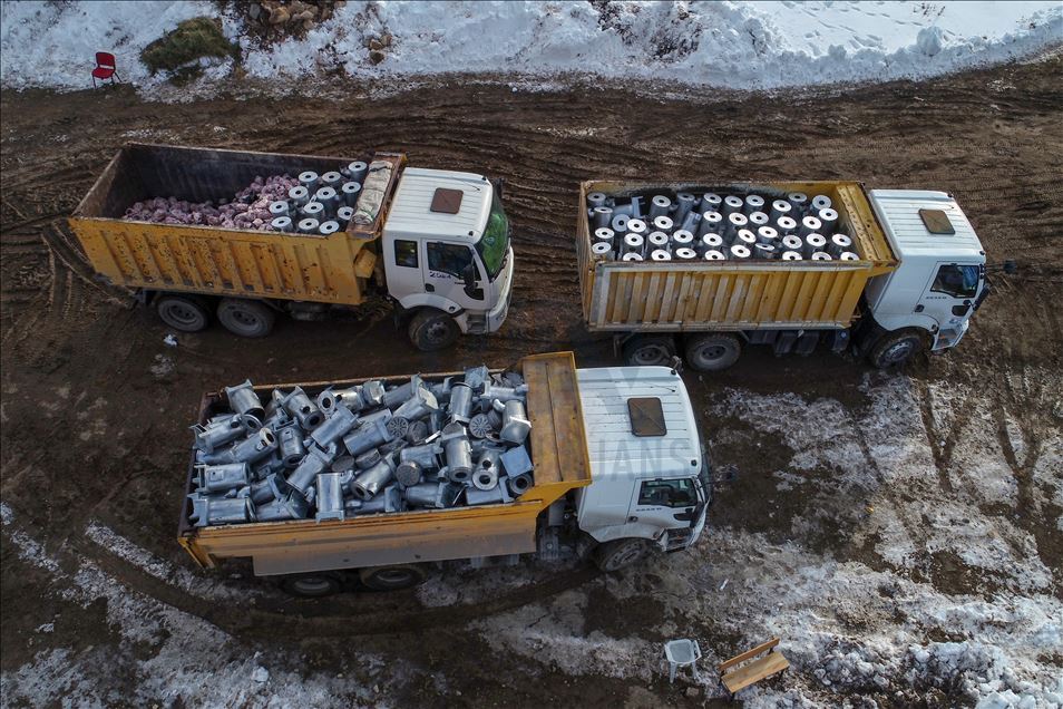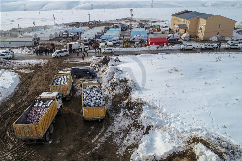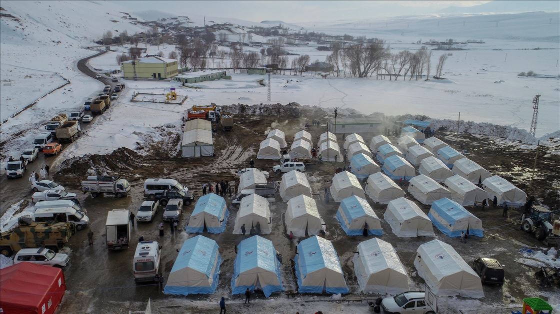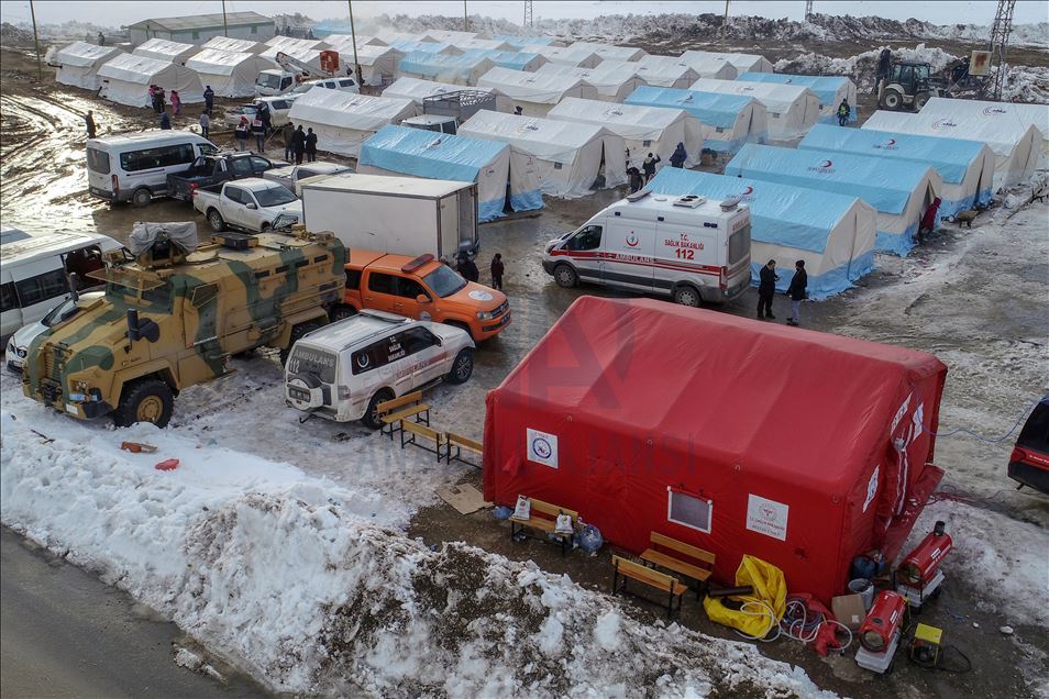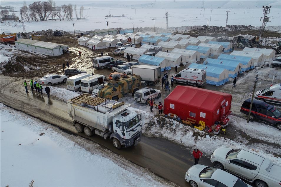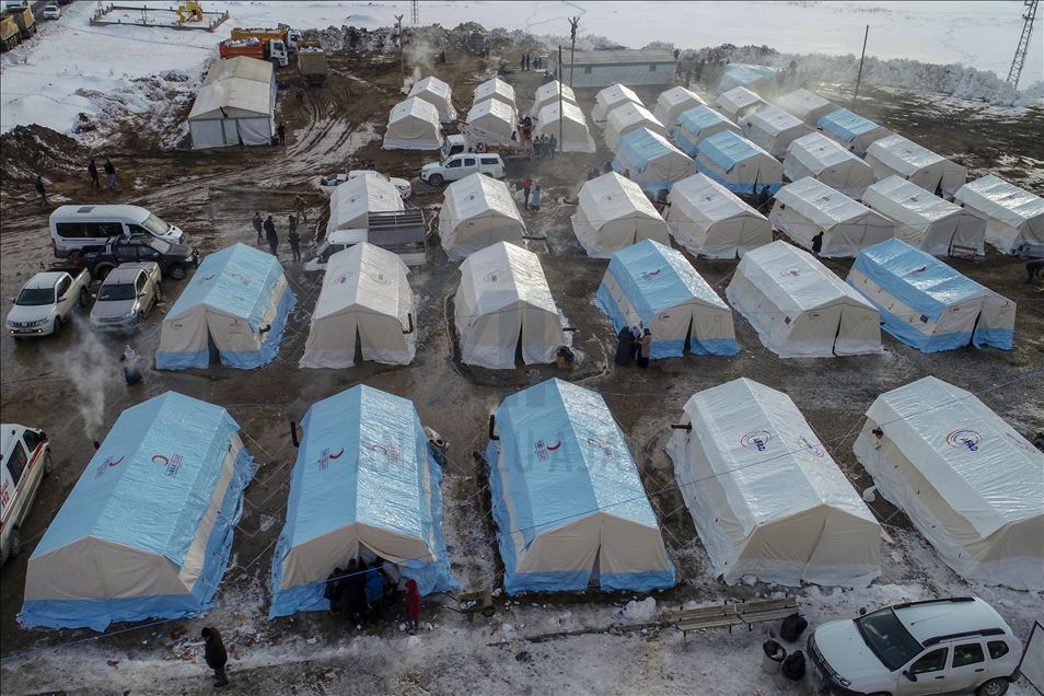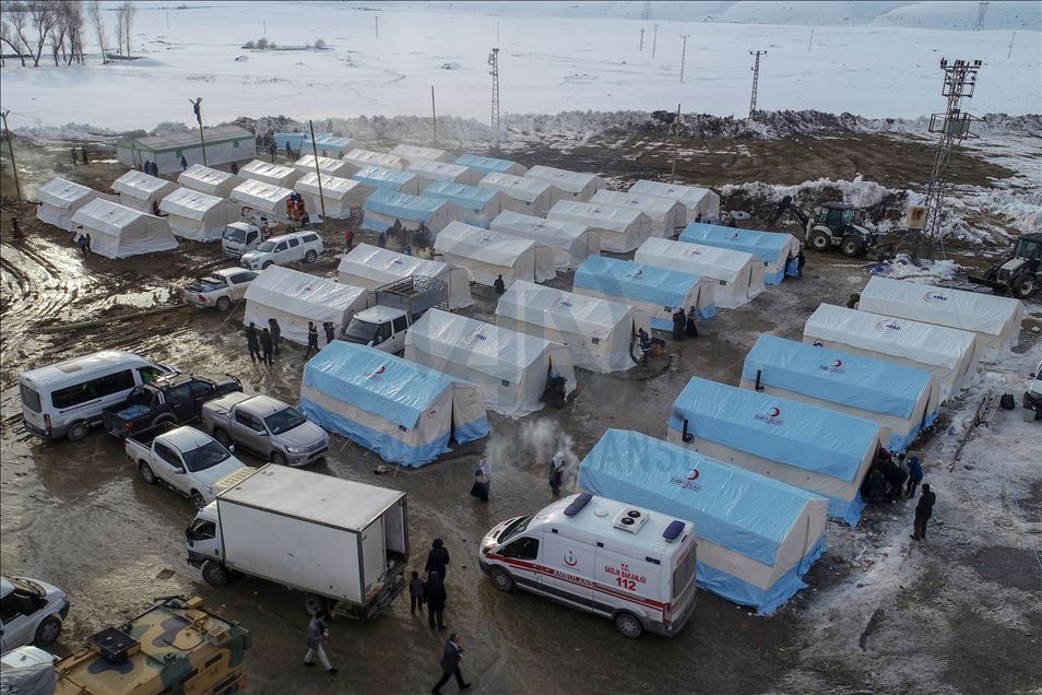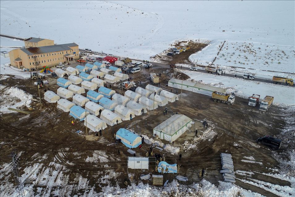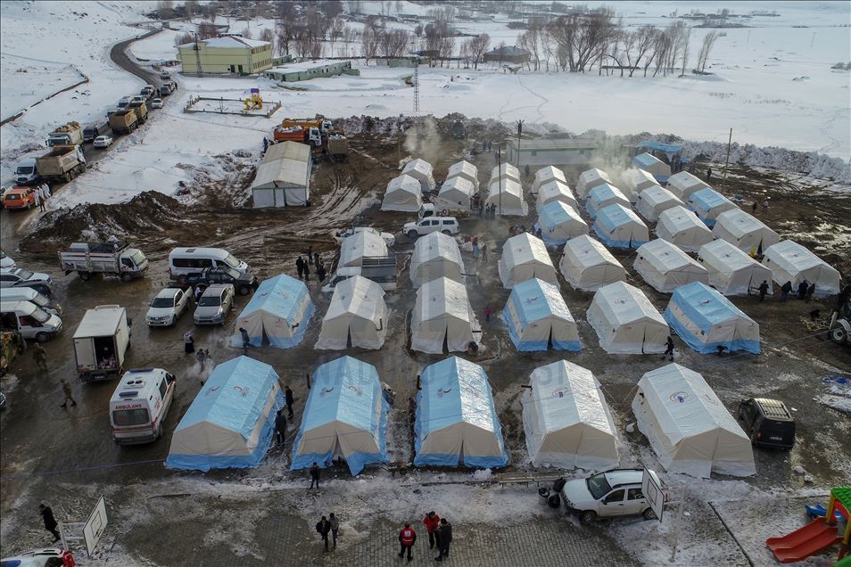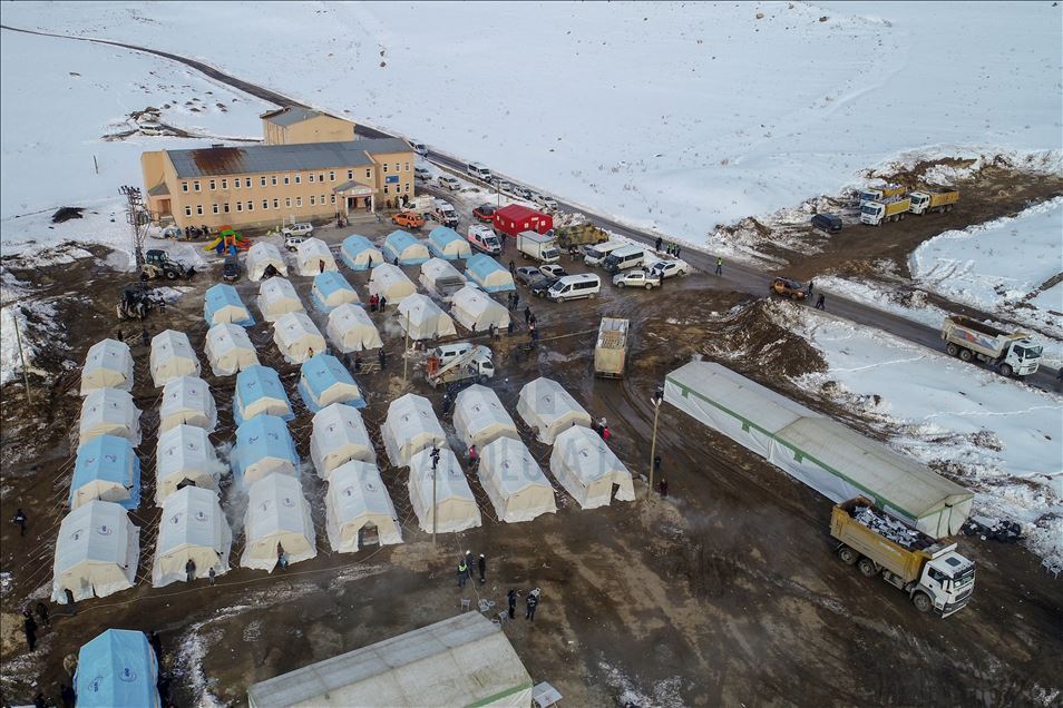 A drone photo shows tents built up by Disaster and Emergency Management Presidency (AFAD) members after a magnitude 5.9 earthquake struck near the border with Iran, in Baskale district in eastern Van province of Turkey on February 24, 2020.