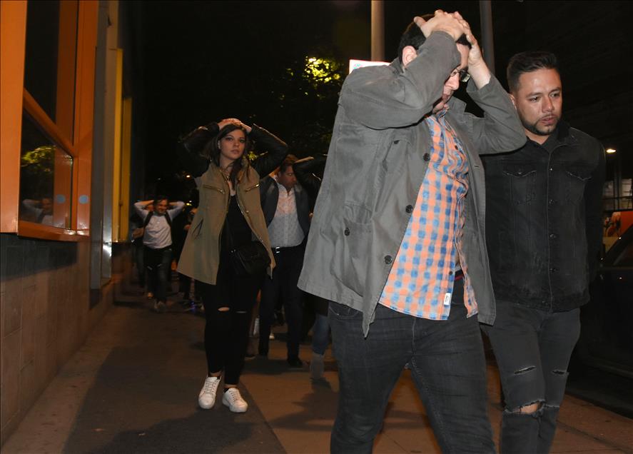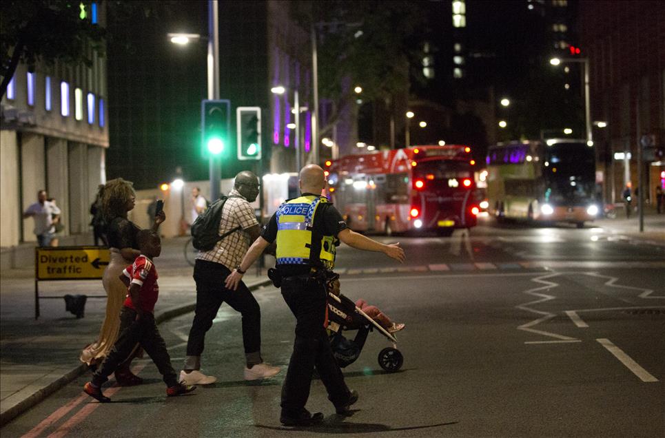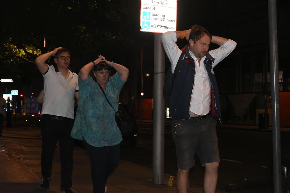 LONDON, ENGLAND - JUNE 3 : Members of the public, leave the scene of an attack on London Bridge in central London on June 3, 2017. UK Police said Saturday they were responding to two incidents on London Bridge and Borough Market amid reports of a van mowing down pedestrians.