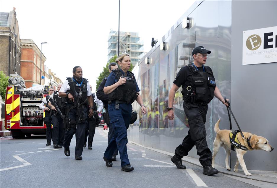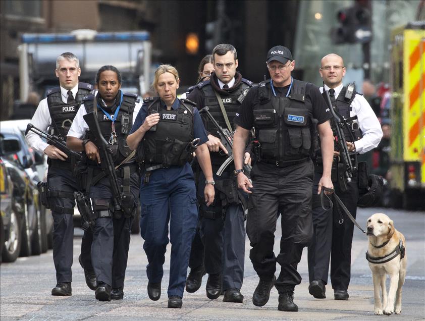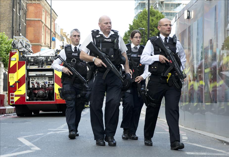 LONDON, ENGLAND - JUNE 4 : Armed police officers walk from Borough Market towards The Shard following last night incident where six people were killed in a terror attack in which three assailants were shot dead by police, on June 4, 2017. At least six people were killed in attacks late Saturday as a van mowed down pedestrians on London Bridge before attackers then stabbed victims at nearby Borough Market. ( Isabel Infantes - Anadolu Agency )Isabel Infantes