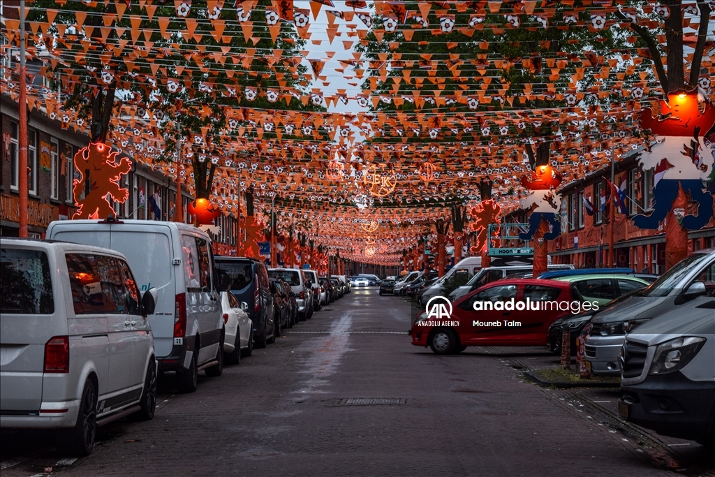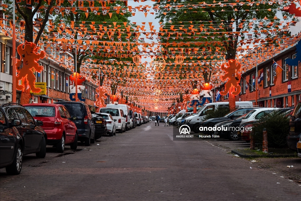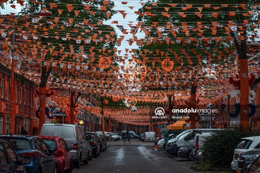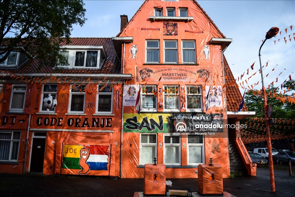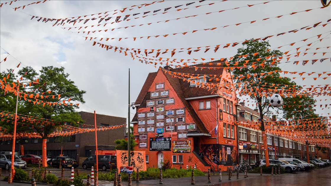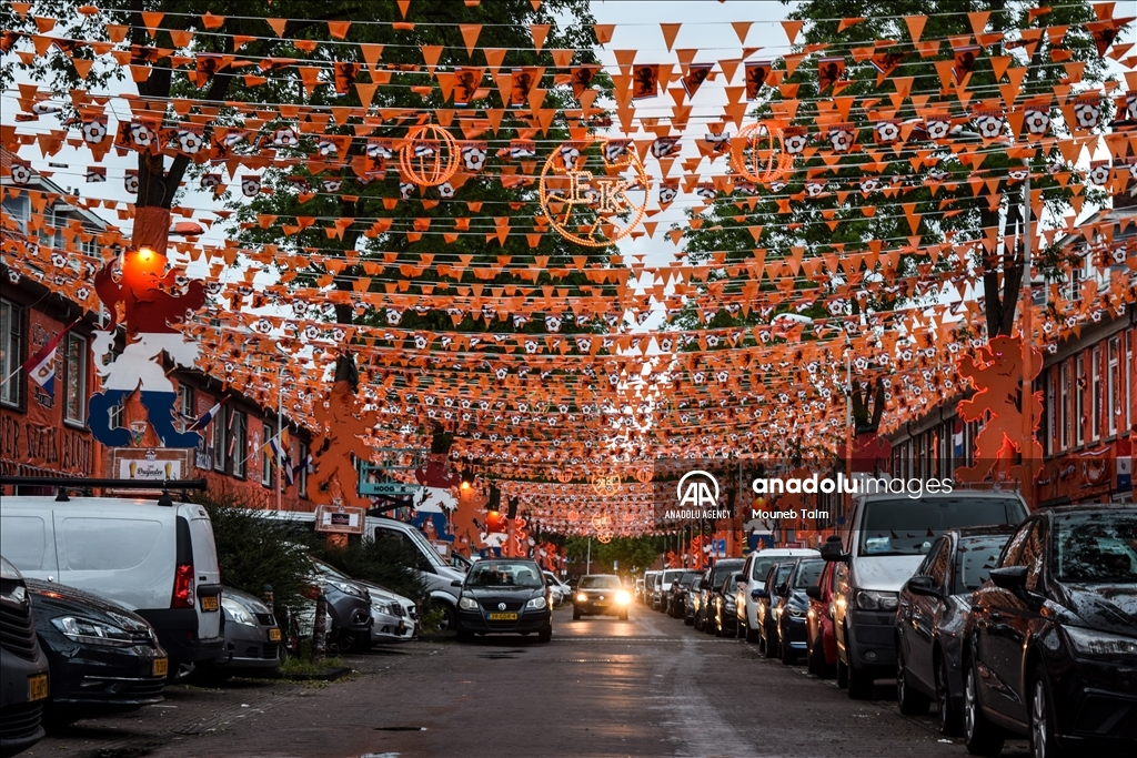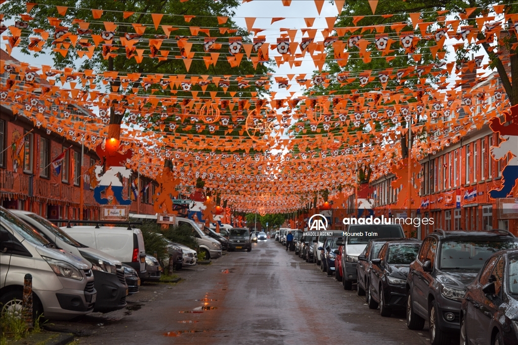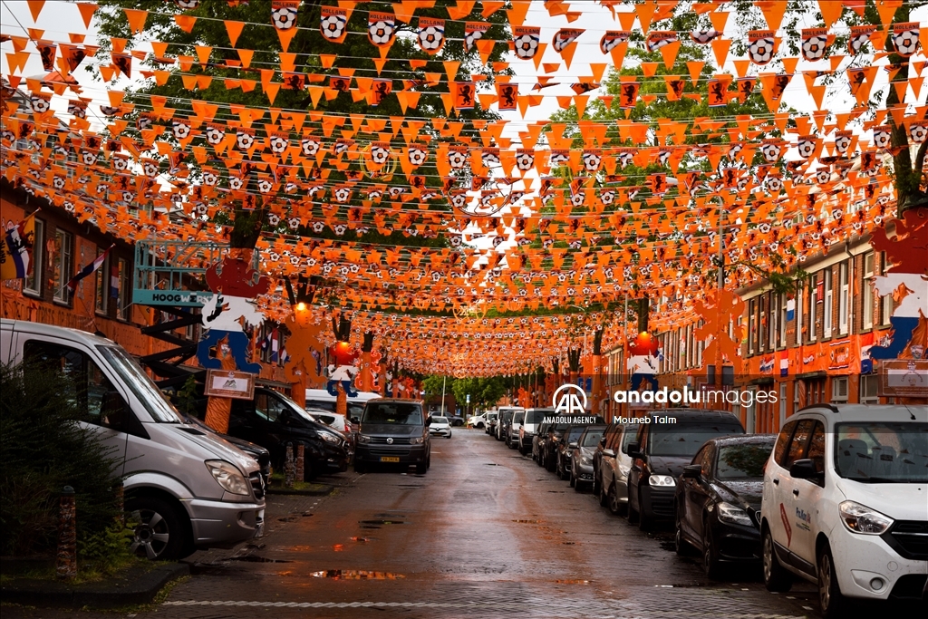 Orange colored street with paints, flags and banners, on June 11, 2024 in The Hague, Netherlands. In anticipation of the European Football Championship, Marktweg in the Netherlands transforms into a stunning display of orange.