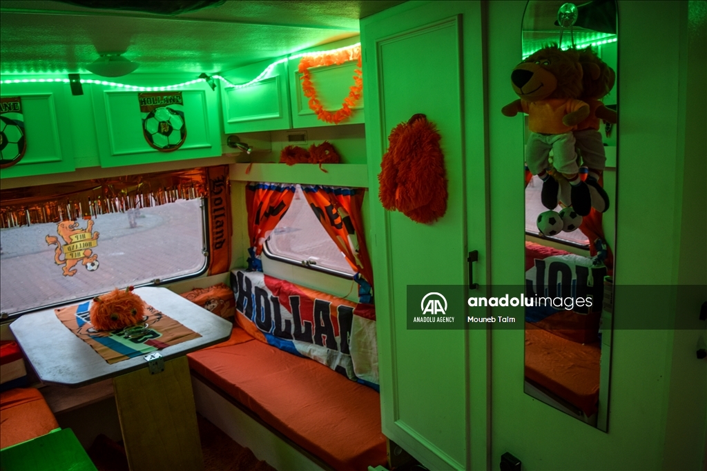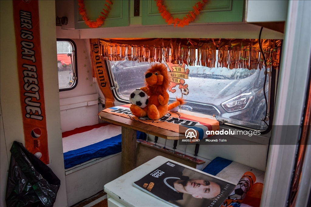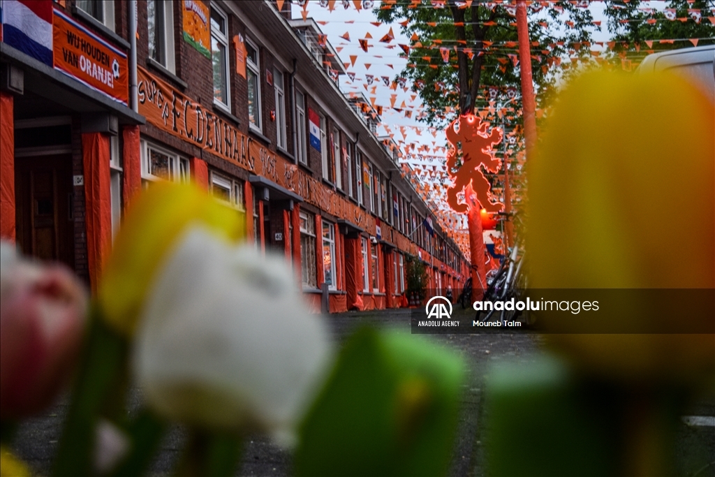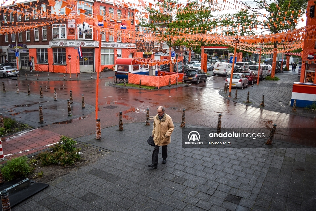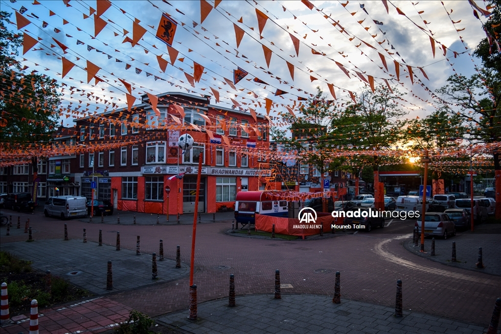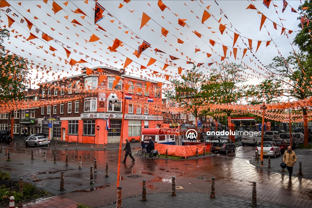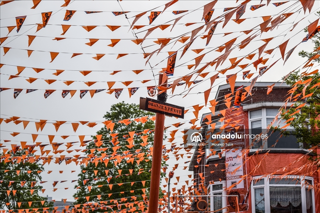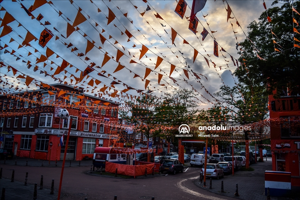 Orange colored street with paints, flags and banners, on June 11, 2024 in The Hague, Netherlands. In anticipation of the European Football Championship, Marktweg in the Netherlands transforms into a stunning display of orange.