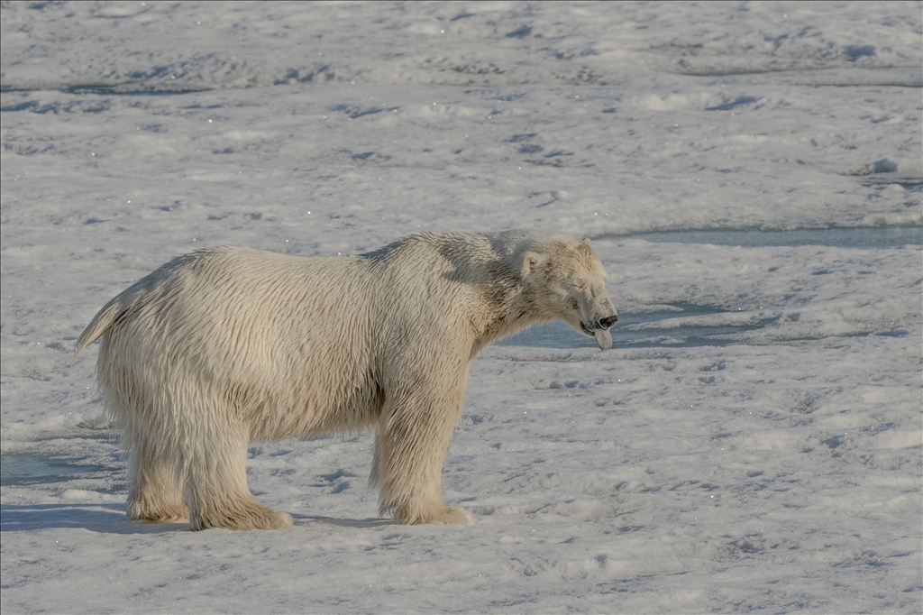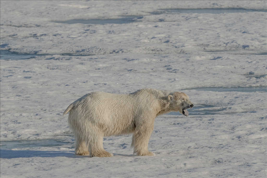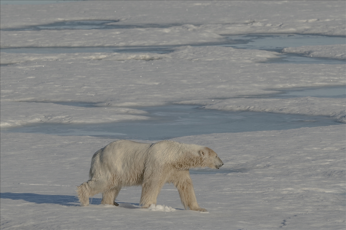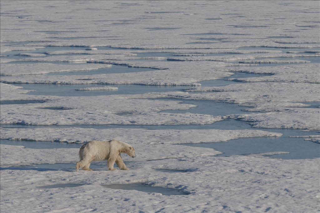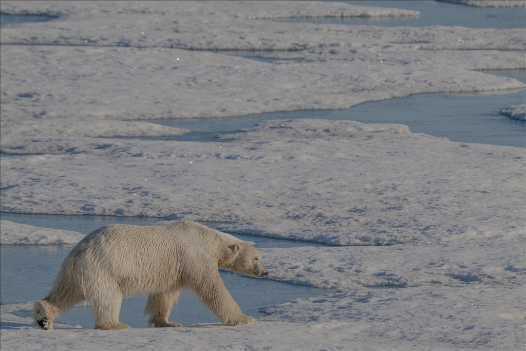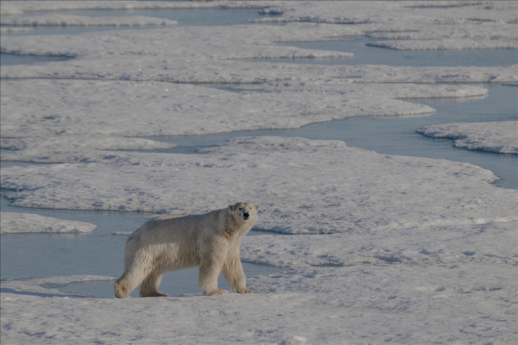 SVALBARD AND JAN MAYEN - JULY 07: A polar bear, one of the Arctic animals, walks on the glacier in Svalbard and Jan Mayen, located in the Arctic, which is home to microorganisms, algae, phytoplankton, thousands of macro- and micro-creatures, and several marine mammals, on July 7, 2024. While the Arctic marine system has many features that make the region unique, shallow water and deep water dynamics in the Arctic, light levels during periodic long periods of light and darkness, and freshwater resources from melting glaciers are very powerful features of the Arctic ecosystem in a global sense, the polar ecosystem also harbors unique endemic species that are found nowhere else on the planet that particularly characterize the Arctic ecosystem. ( Şebnem Coşkun - Anadolu Agency )Şebnem Coşkun