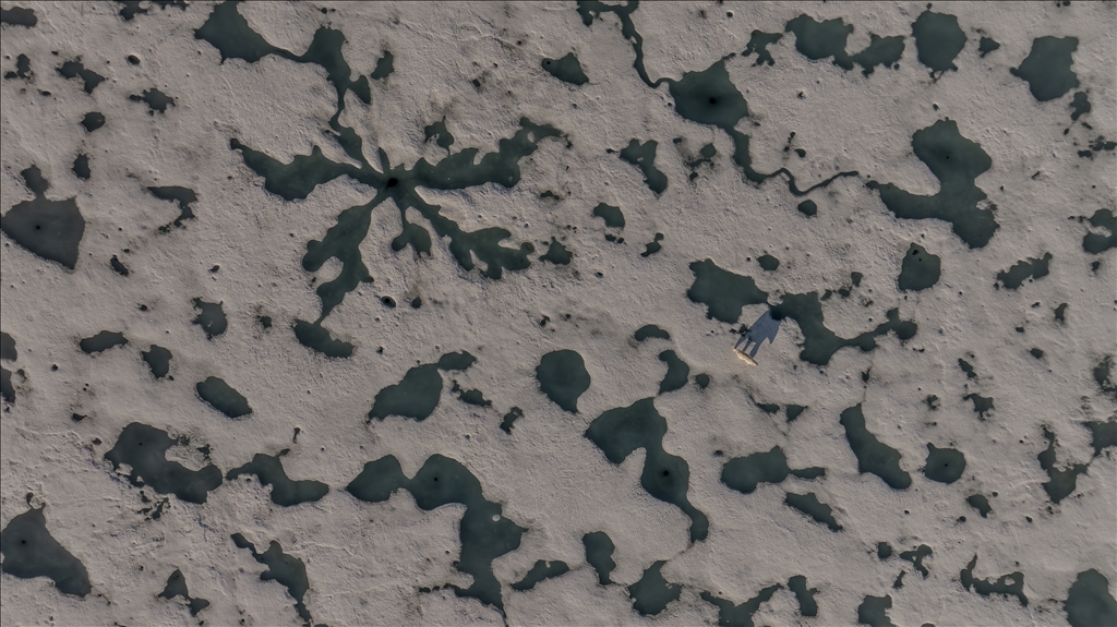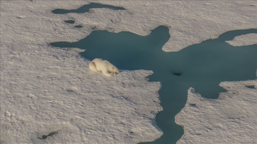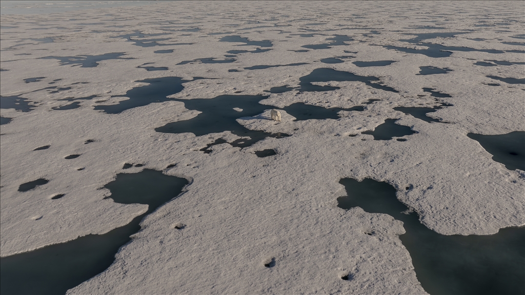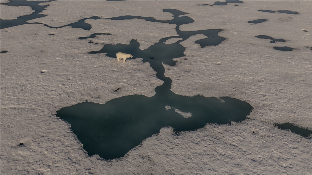 SVALBARD AND JAN MAYEN - JULY 07: An aerial view of a polar bear, one of the Arctic animals, walking on the glacier in Svalbard and Jan Mayen, located in the Arctic, which is home to microorganisms, algae, phytoplankton, thousands of macro- and micro-creatures, and several marine mammals, on July 7, 2024. While the Arctic marine system has many features that make the region unique, shallow water and deep water dynamics in the Arctic, light levels during periodic long periods of light and darkness, and freshwater resources from melting glaciers are very powerful features of the Arctic ecosystem in a global sense, the polar ecosystem also harbors unique endemic species that are found nowhere else on the planet that particularly characterize the Arctic ecosystem. ( Şebnem Coşkun - Anadolu Agency )Şebnem Coşkun