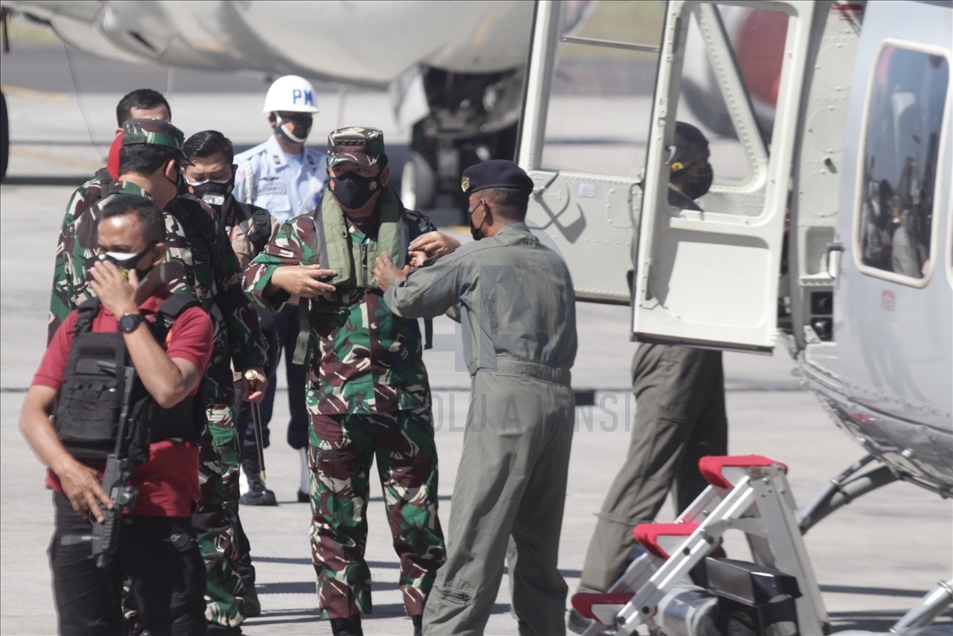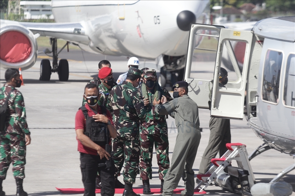 Indonesian Military Commander Hadi Tjahjanto (2nd R) boards a helicopter to Warship Suharso for the search operation of submarine KRI Nanggala 402 which went missing in the waters off the island of Bali in Bali, Indonesia on April 22, 2021.Zul Trionggono Edoardo