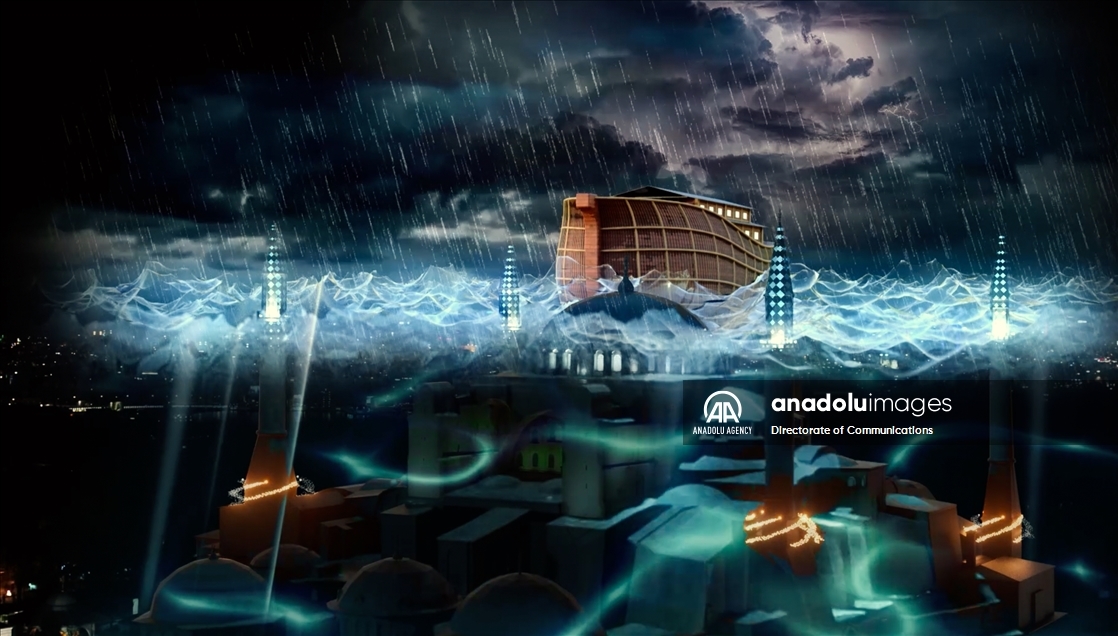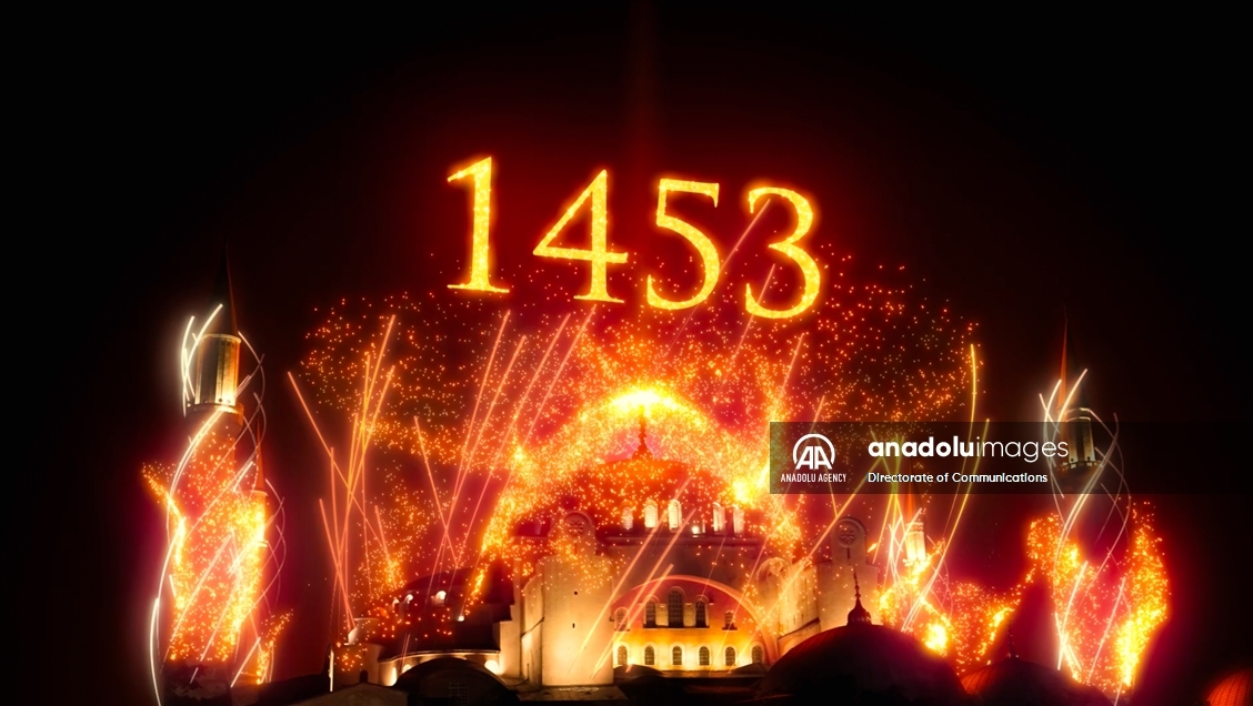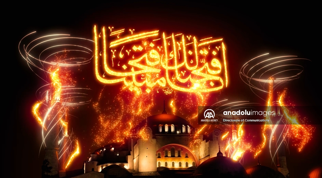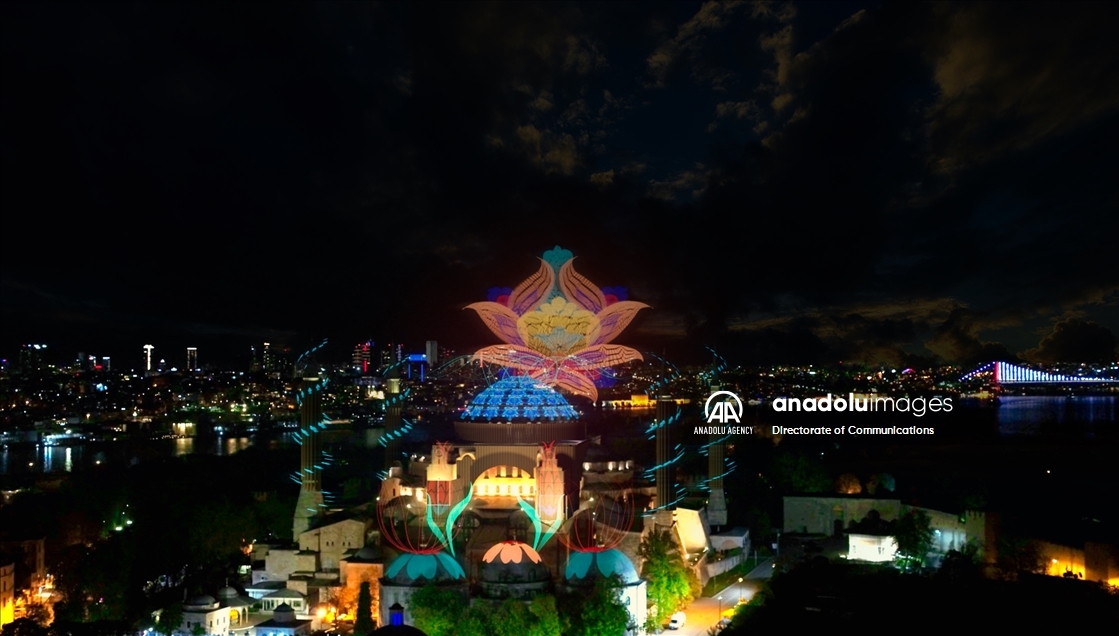 ISTANBUL, TURKEY - MAY 29: (----EDITORIAL USE ONLY – MANDATORY CREDIT - "DIRECTORATE OF COMMUNICATIONS / HANDOUT" - NO MARKETING NO ADVERTISING CAMPAIGNS - DISTRIBUTED AS A SERVICE TO CLIENTS----) Hagia Sophia Grand Mosque is illuminated with video mapping show on the 568th anniversary of Istanbul's conquest, in Istanbul, Turkey on May 29, 2021. ( Directorate of Communications - Anadolu Agency )Directorate of Communications