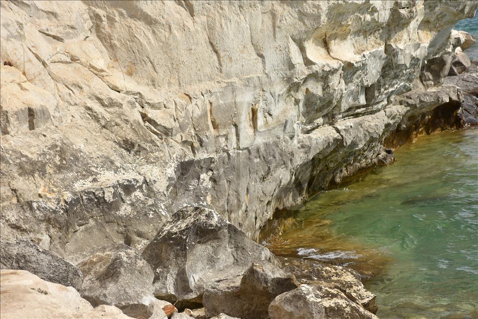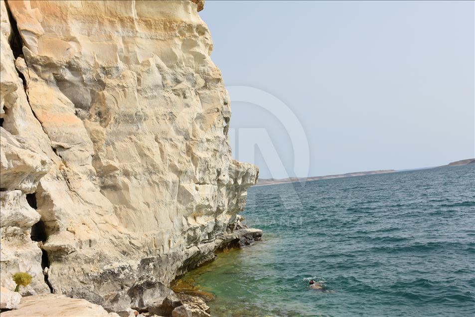 ADIYAMAN, TURKEY - OCTOBER 11: A man swims near a cliff with rock paintings, which appeared after the water level has dropped and caught the eyes of fishermen fishing at Ataturk Dam, from the paleolithic era in Kahta district of Adiyaman, Turkey on October 11, 2018. Carvings, occupy an area of 8 meters in length and 70 centimeters in width display a wild goat hunting scene and cavalry imagery. Water level dropped 10 to 15 meters before paintings appeared. Dam water caused only a little damage on the paintings. ( Kemal Karagöz - Anadolu Agency )Kemal Karagöz