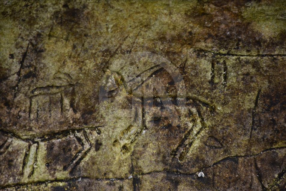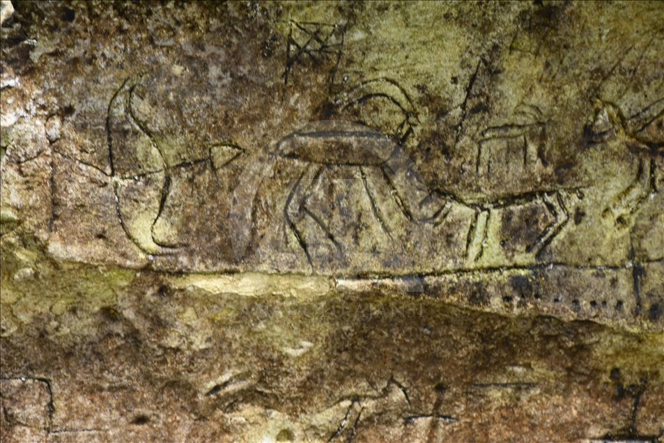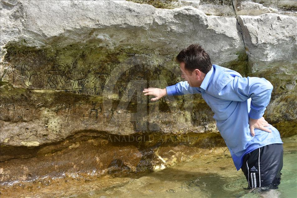 ADIYAMAN, TURKEY - OCTOBER 11: The rock paintings, which appeared after the water level has dropped and caught the eyes of fishermen fishing at Ataturk Dam, from the paleolithic era are seen in Kahta district of Adiyaman, Turkey on October 11, 2018. Carvings, occupy an area of 8 meters in length and 70 centimeters in width display a wild goat hunting scene and cavalry imagery. Water level dropped 10 to 15 meters before paintings appeared. Dam water caused only a little damage on the paintings.