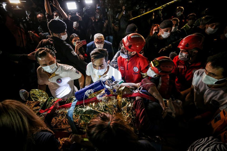 IZMIR, TURKEY - OCTOBER 30: Buse Hasyilmaz, who was under the rubbles for 9,5 hours, is being carried after rescued as search and rescue works continue at debris after a magnitude 6.6 quake shook Turkey's Aegean Sea coast, in Izmir, Turkey on October 30, 2020. ( Sergen Sezgin - Anadolu Agency )Sergen Sezgin