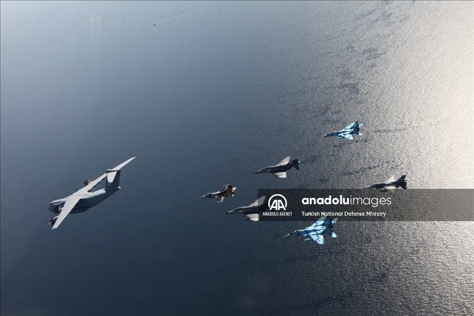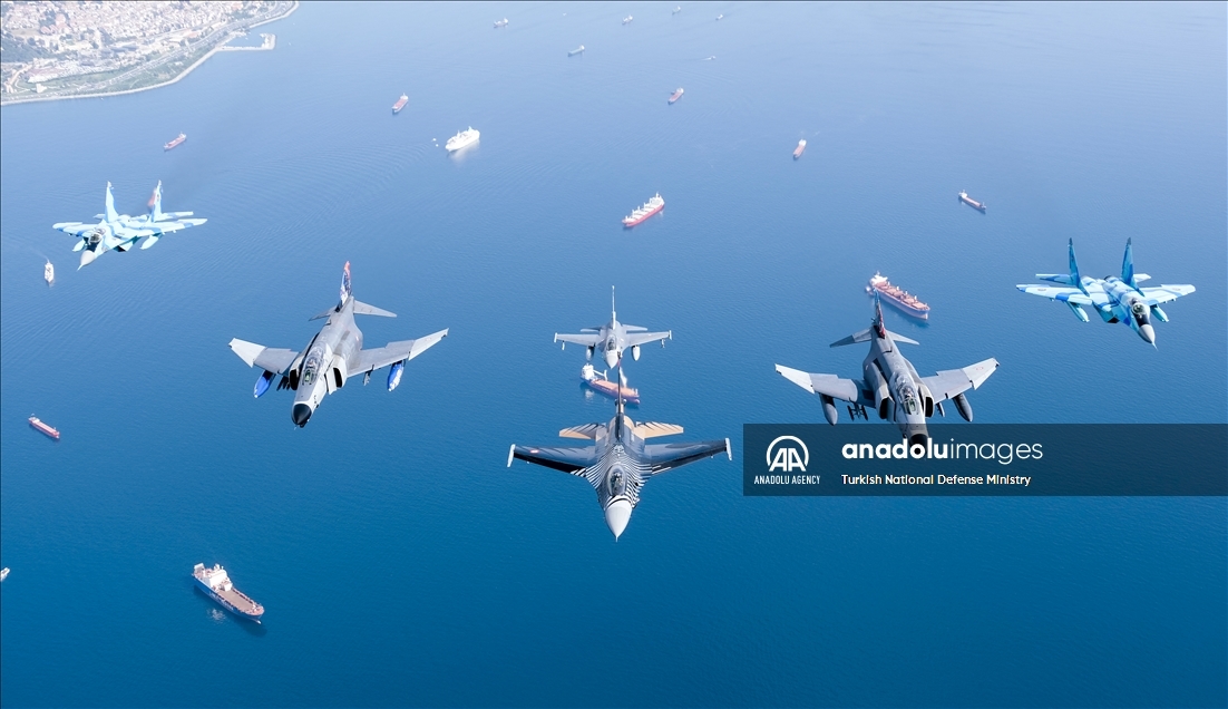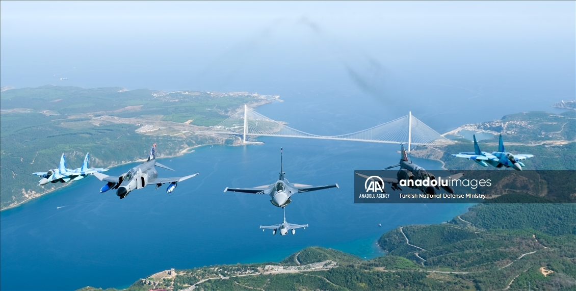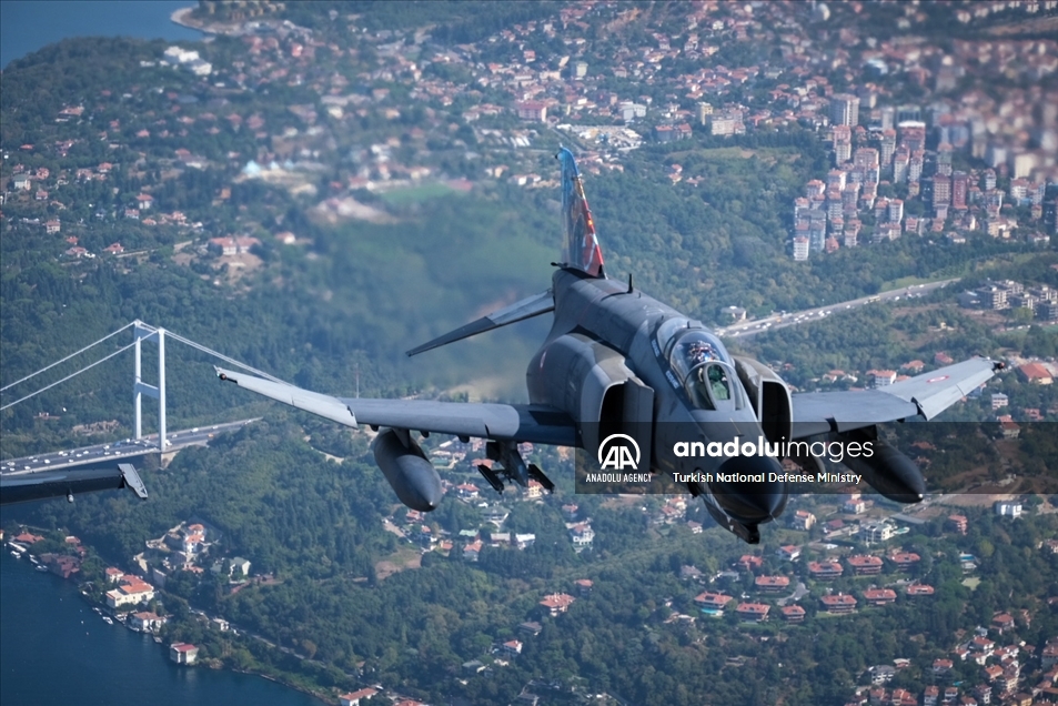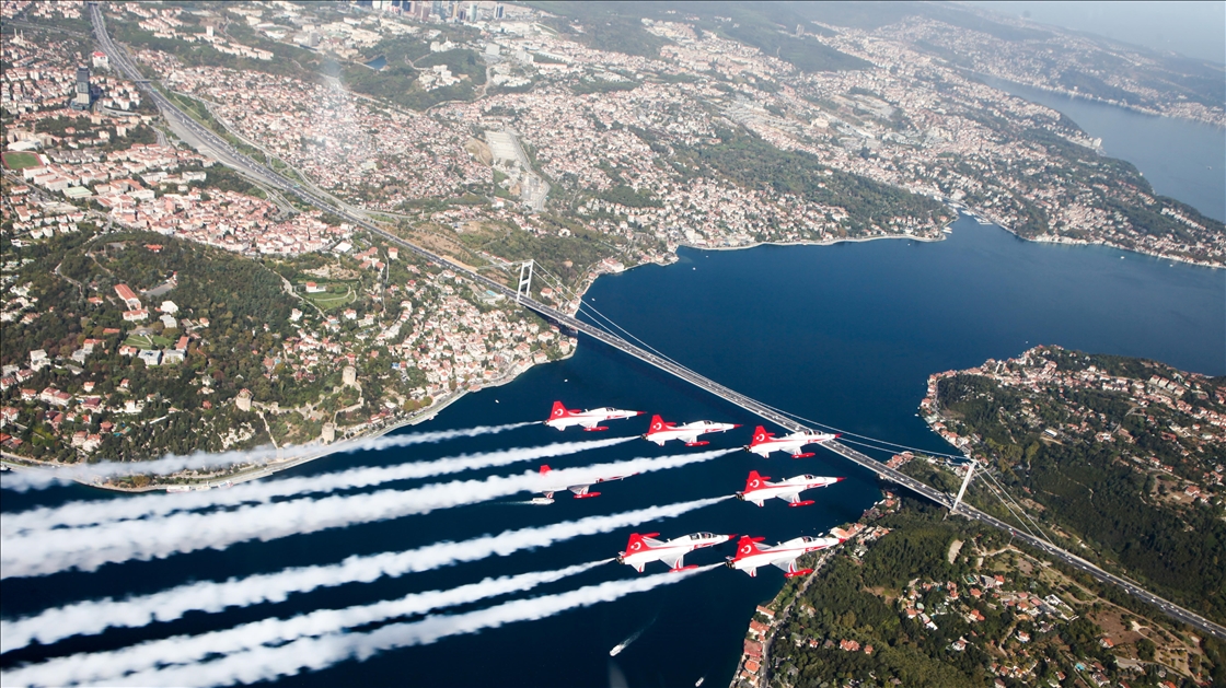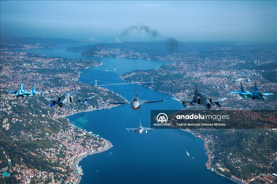 A view of planes of 'SOLOTURK', the aerobatic demonstration team of the Turkish Air Forces, Turkish Stars, the aerobatic demonstration team of the Turkish Air Forces and Azerbaijani Air Forces fly over the Bosphorus