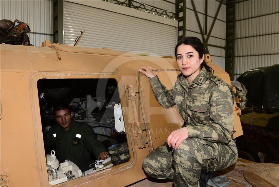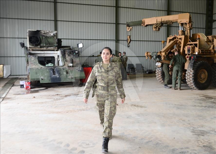 AFRIN, SYRIA - FEBRUARY 27 : First Lieutenant Gulru Gizem Atabey (C), the commander of the maintenance unit and responsible for the maintenance of the military vehicles used in the operation, walks as she takes part in the "Operation Olive Branch" in Afrin, Syria on February 27, 2018. Female personnel of the Turkish Armed Forces deployed on the border are actively participating in the country’s ongoing counter-terrorism operation in Syria’s northwestern region. Turkey launched Operation Olive Branch on January 20 in Syria’s northwestern Afrin region; the aim of the operation is to establish security and stability along Turkish borders and the region as well as to eliminate PKK/KCK/PYD-YPG and Daesh terror groups, and protect the Syrian people from the oppression and cruelty of terrorists. ( Soner Kılınç - Anadolu Agency )Soner Kılınç