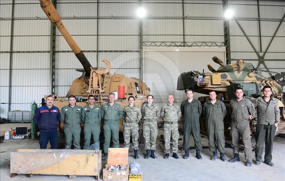 AFRIN, SYRIA - FEBRUARY 27 : First Lieutenant Gulru Gizem Atabey (R), the commander of the maintenance unit and responsible for the maintenance of the military vehicles used in the operation, checks materials with a staff as they take part in the "Operation Olive Branch" in Afrin, Syria on February 27, 2018. Female personnel of the Turkish Armed Forces deployed on the border are actively participating in the country’s ongoing counter-terrorism operation in Syria’s northwestern region. Turkey launched Operation Olive Branch on January 20 in Syria’s northwestern Afrin region; the aim of the operation is to establish security and stability along Turkish borders and the region as well as to eliminate PKK/KCK/PYD-YPG and Daesh terror groups, and protect the Syrian people from the oppression and cruelty of terrorists. ( Soner Kılınç - Anadolu Agency )Soner Kılınç