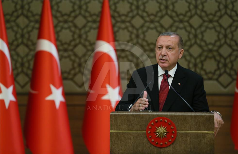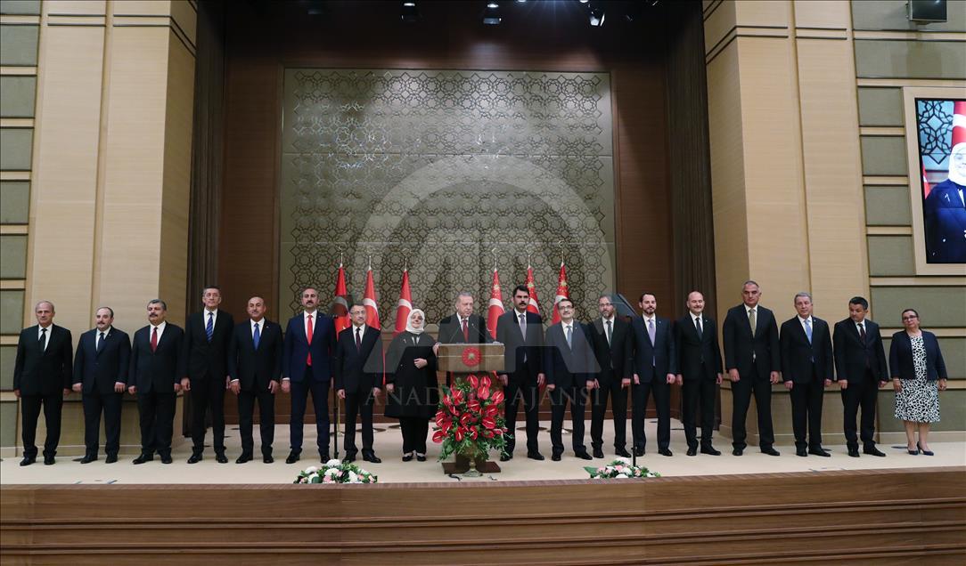 ANKARA, TURKEY - JULY 9: (----EDITORIAL USE ONLY – MANDATORY CREDIT - "TURKISH PRESIDENCY / MURAT CETINMUHURDAR / HANDOUT" - NO MARKETING NO ADVERTISING CAMPAIGNS - DISTRIBUTED AS A SERVICE TO CLIENTS----) Turkish President Recep Tayyip Erdogan announces Turkish Cabinet after taking oath as first president under new government system, in Ankara, Turkey on July 9, 2018. President Recep Tayyip Erdogan has unveiled the new 16-minister Cabinet in the presidential complex in the capital Ankara.
