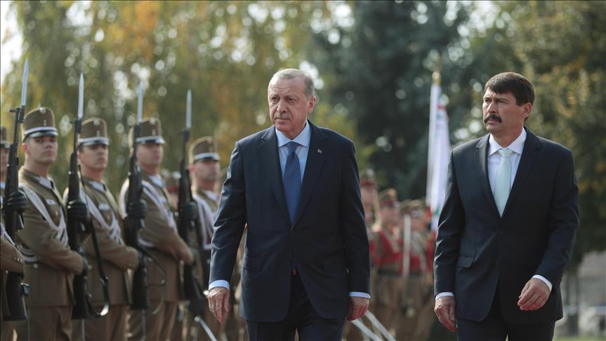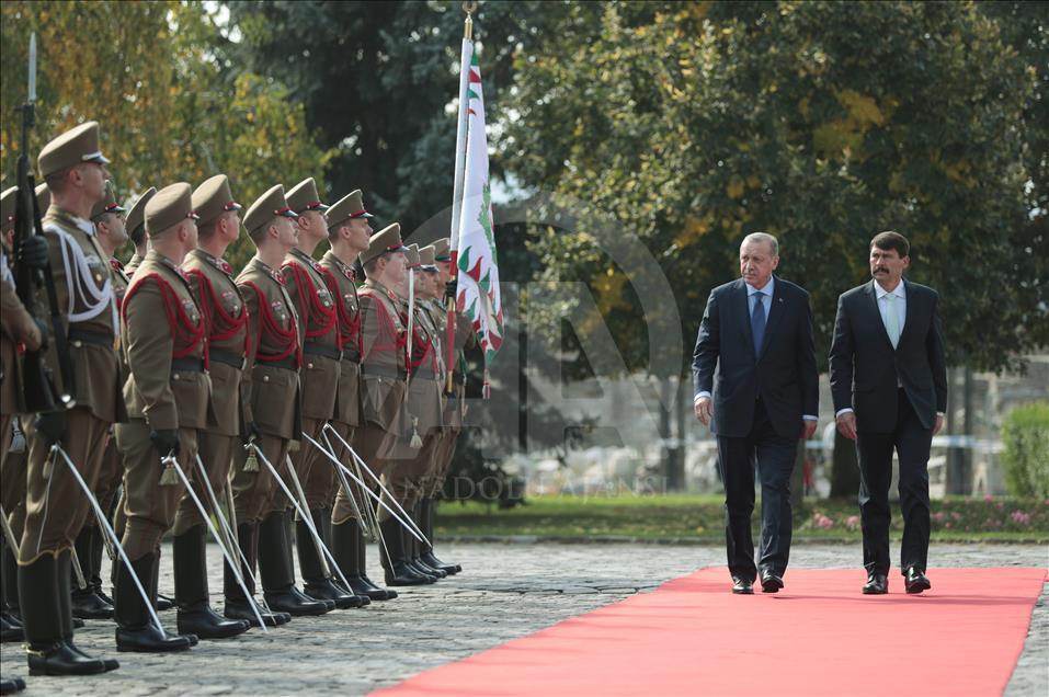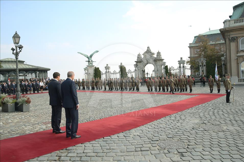 Turkish President Recep Tayyip Erdogan (C-L) is welcomed by President of Hungary Janos Ader (C-R) with an official ceremony at the Presidential Palace in Budapest, Hungary on October 08, 2018.
