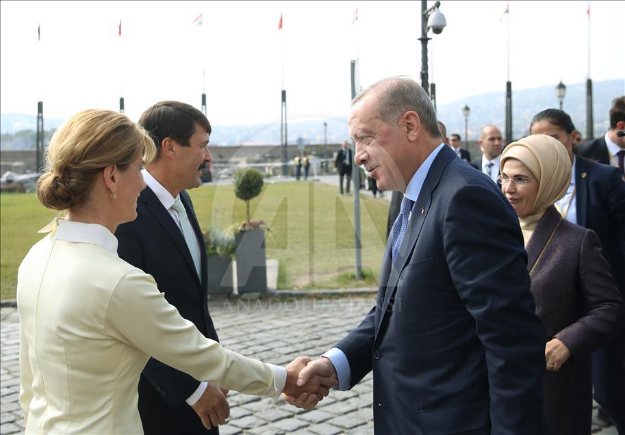 BUDAPEST, HUNGARY - OCTOBER 08: Turkish President Recep Tayyip Erdogan (R) is welcomed by President of Hungary Janos Ader (2nd L) and his wife Anita Herczegh (L) with an official ceremony at the Presidential Palace in Budapest, Hungary on October 08, 2018. ( Murat Kula - Anadolu Agency )Murat Kula