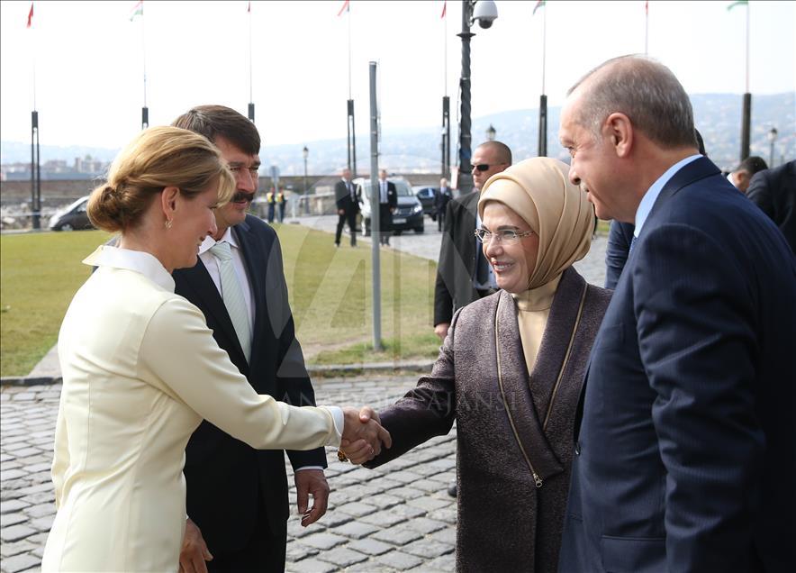 BUDAPEST, HUNGARY - OCTOBER 08: Turkish President Recep Tayyip Erdogan (2nd R) and his wife Emine Erdogan (R) are welcomed by President of Hungary Janos Ader (2nd L) and his wife Anita Herczegh (L) with an official ceremony at the Presidential Palace in Budapest, Hungary on October 08, 2018. ( Murat Kula - Anadolu Agency )Murat Kula