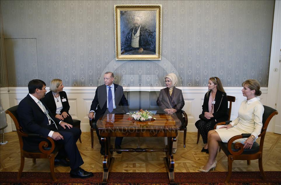 BUDAPEST, HUNGARY - OCTOBER 8: Turkish President Recep Tayyip Erdogan (3rd L) meets with President of Hungary, Janos Ader (L) at Presidential Palace in Budapest, Hungary on October 08, 2018. Turkish President Recep Tayyip Erdogan's wife Emine Erdogan (3rd R) and President of Hungary, Janos Ader's wife Anita Herczegh (R) also attended the meeting.