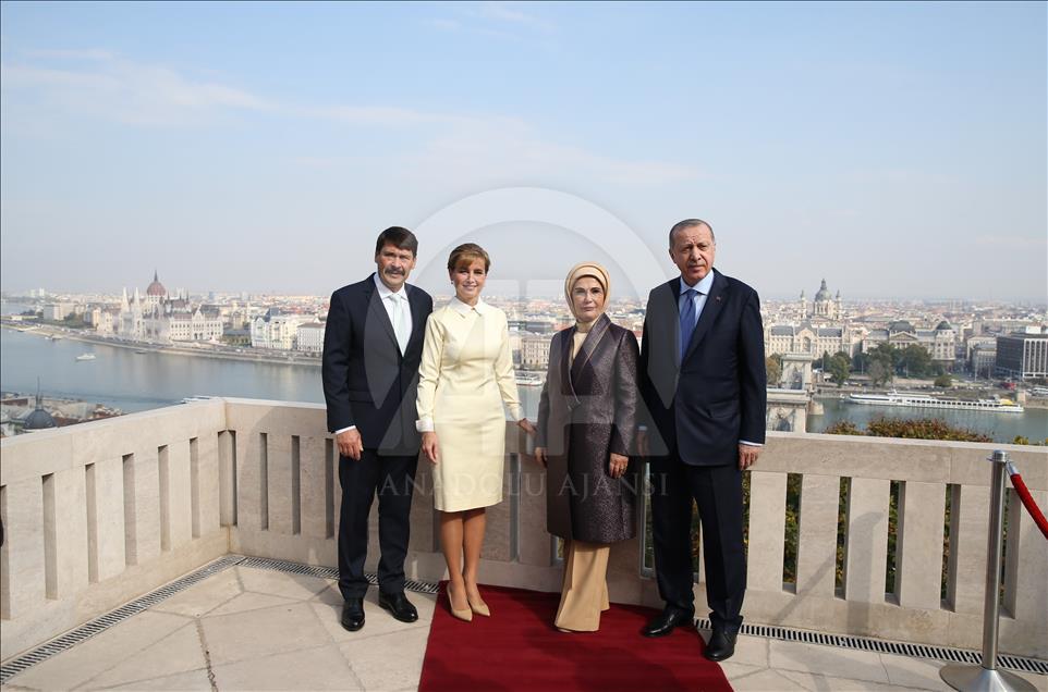 BUDAPEST, HUNGARY - OCTOBER 08: Turkish President Recep Tayyip Erdogan (R) and his wife Emine Erdogan (2nd R) talk to President of Hungary Janos Ader (L) and his wife Anita Herczegh (2nd L) pose for a photo at the Presidential Palace in Budapest, Hungary on October 08, 2018. ( Murat Kula - Anadolu Agency )Murat Kula