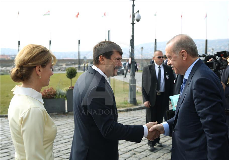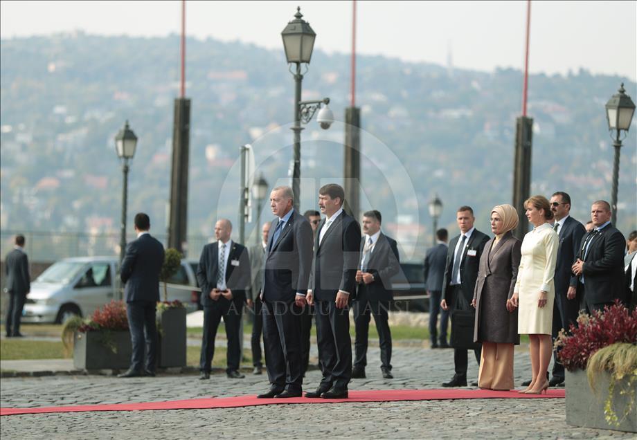 BUDAPEST, HUNGARY - OCTOBER 08: (----EDITORIAL USE ONLY – MANDATORY CREDIT - "TURKISH PRESIDENCY / MURAT CETINMUHURDAR / HANDOUT" - NO MARKETING NO ADVERTISING CAMPAIGNS - DISTRIBUTED AS A SERVICE TO CLIENTS----) Turkish President Recep Tayyip Erdogan and his wife Emine Erdogan are welcomed by President of Hungary Janos Ader and his wife Anita Herczegh with an official ceremony at the Presidential Palace in Budapest, Hungary on October 08, 2018. ( TURKISH PRESIDENCY / MURAT CETINMUHURDAR / HANDOUT - Anadolu Agency )TURKISH PRESIDENCY / MURAT CETINMUHURDAR / HANDOUT