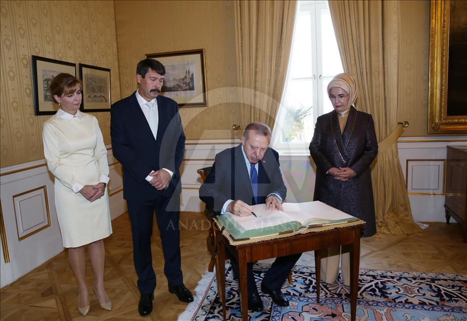 BUDAPEST, HUNGARY - OCTOBER 8: Turkish President Recep Tayyip Erdogan (2nd R) signs the guest book as he meets with President of Hungary, Janos Ader (2nd L) at Presidential Palace in Budapest, Hungary on October 08, 2018. Turkish President Recep Tayyip Erdogan's wife Emine Erdogan (R) and President of Hungary, Janos Ader's wife Anita Herczegh (L) also attended the meeting.