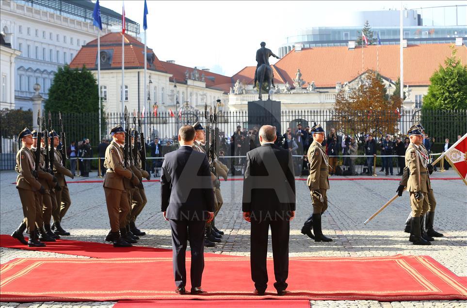 WARSAW, POLAND - OCTOBER 17 : Turkish President Recep Tayyip Erdogan (L) meets with President of Poland Andrzej Duda (R) after an official welcoming ceremony at Presidential Palace in Warsaw, Poland on October 17, 2017. Kayhan Özer