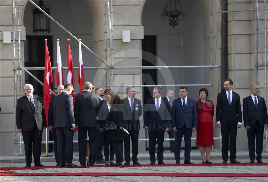 WARSAW, POLAND - OCTOBER 17 : Turkish President Recep Tayyip Erdogan (4th L) is welcomed by President of Poland Andrzej Duda (3rd L) with an official welcoming ceremony at Presidential Palace in Warsaw, Poland on October 17, 2017. Murat Kula