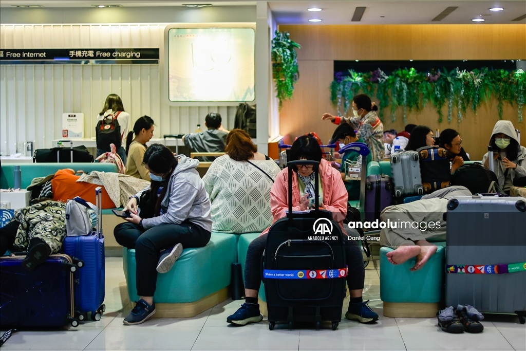 TAOYUAN, TAIWAN - OCTOBER 02: People wait for flights at Taoyuan International Airport, as Typhoon Krathon (Julien) approaching the island prompted flights to cancel or reschedule, in Taoyuan, Taiwan, on 2 October, 2024. All schools and work across Taiwan have been suspended as a precaution against possible catastrophic damages. All domestic and a number international flights including those bound for Japan, Hong Kong, Macau and Singapore scheduled for Wednesday have been canceled or rescheduled, as Typhoon Krathon is expected to make landfall with strong wind and heavy rains on October 02 after hitting the Philippines. ( Daniel Ceng - Anadolu Agency )Daniel Ceng