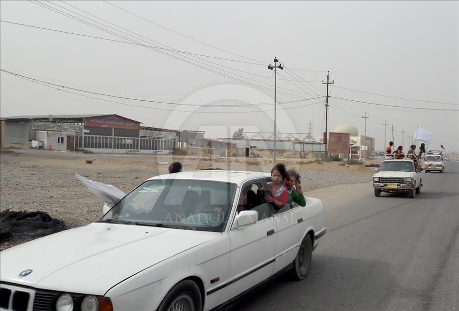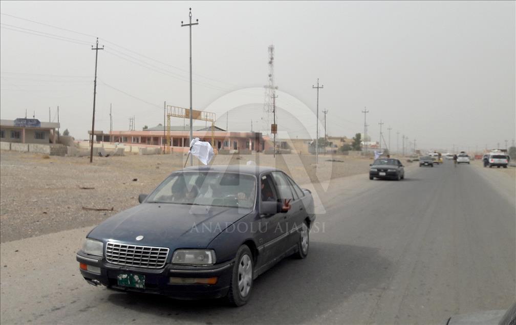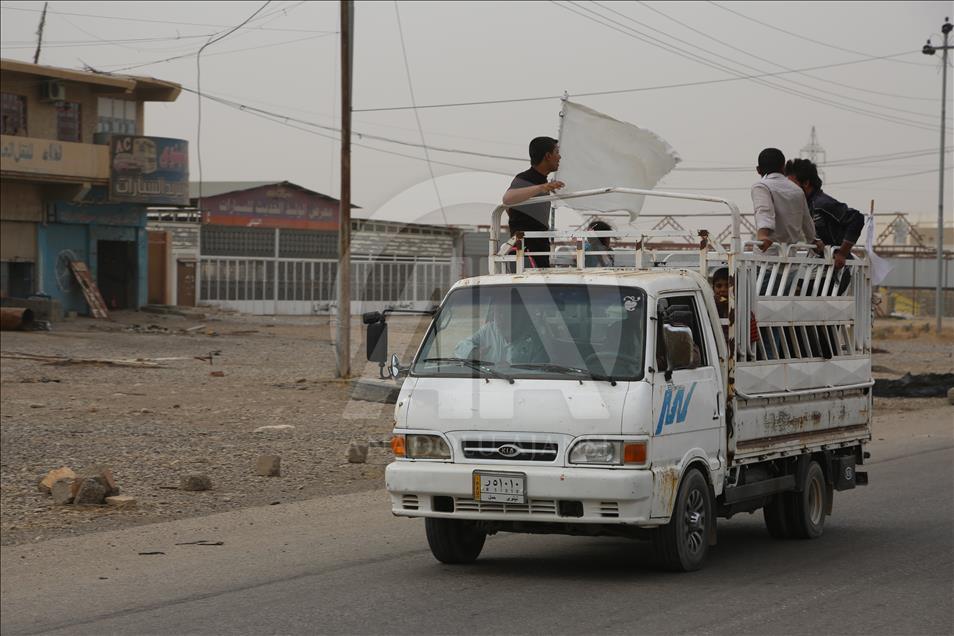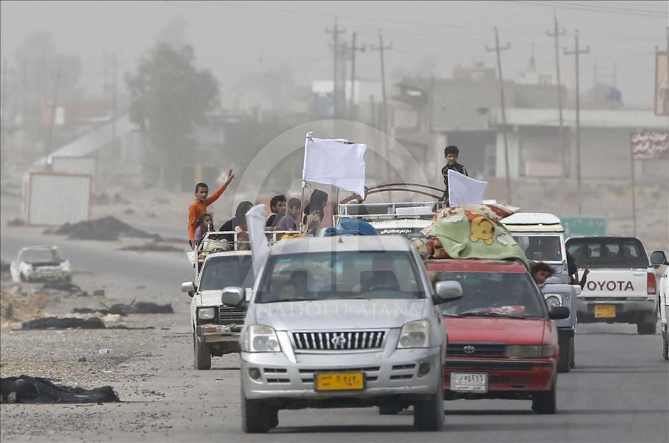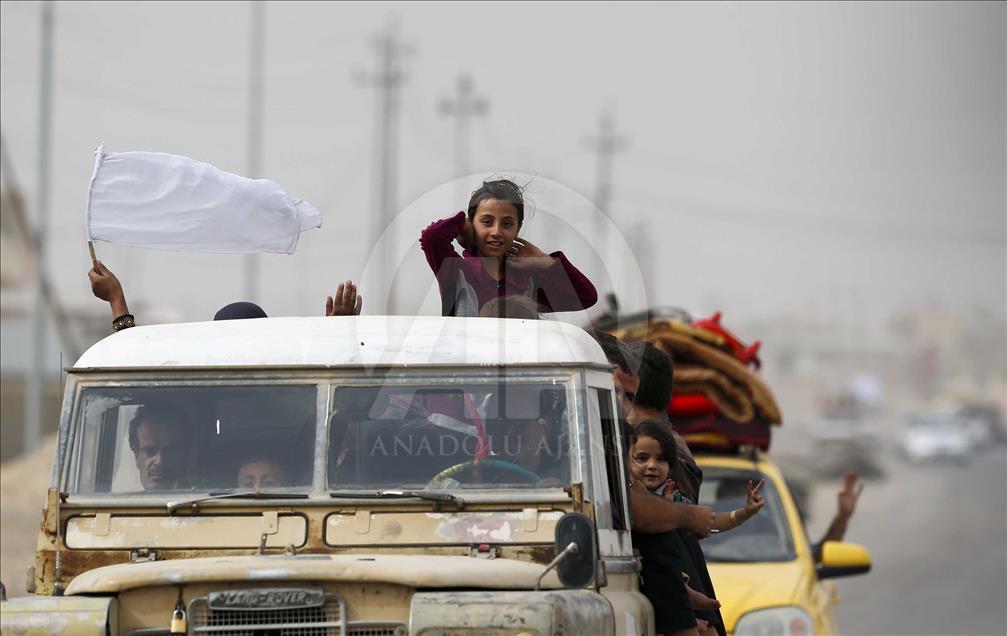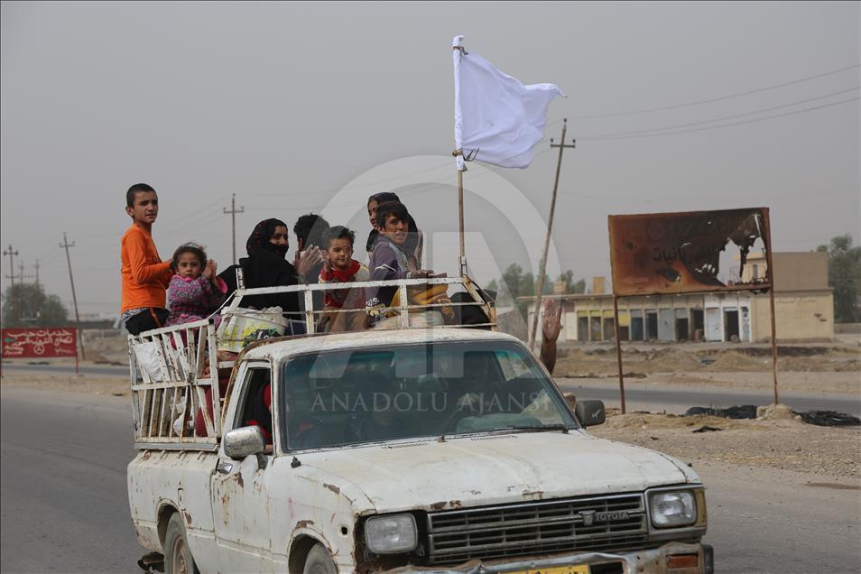 Civilians holding white flags in order not to be fired upon, are seen on the road to find safer locations as the operation to retake Iraq's Mosul from Daesh continues in Bazwaya village located near Kokceli neighborhood of Mosul where the Iraqi army arrived in, on November 1, 2016.