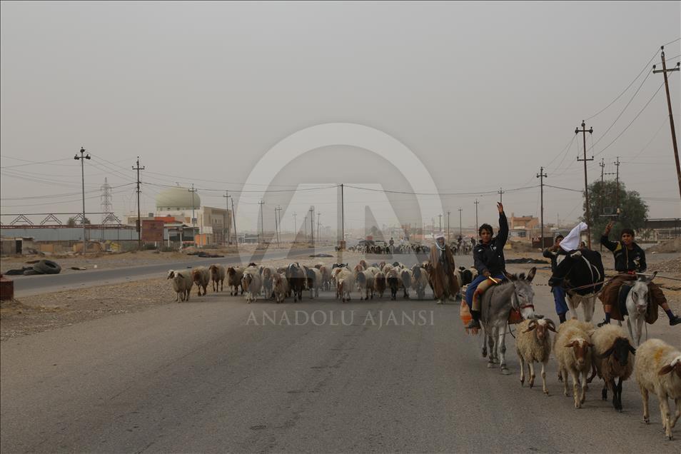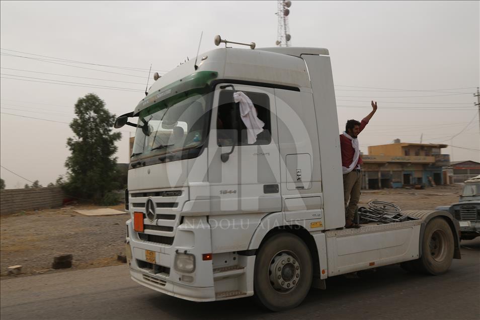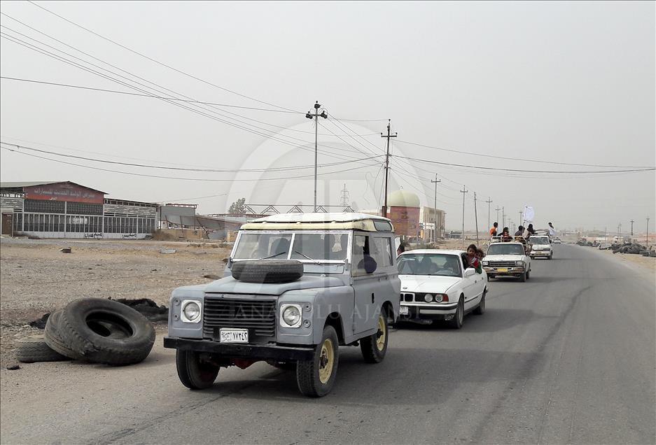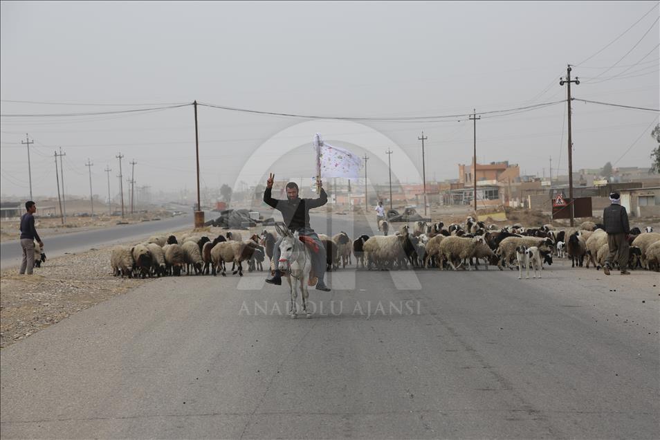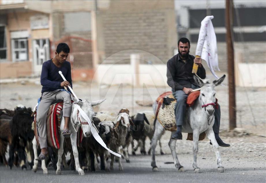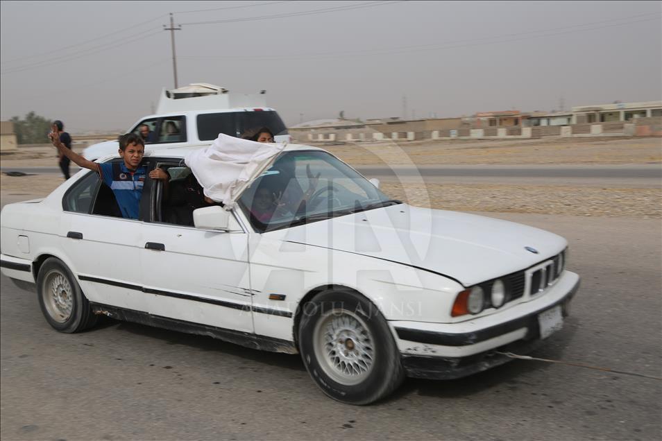 Civilians holding white flags in order not to be fired upon, are seen on the road to find safer locations as the operation to retake Iraq's Mosul from Daesh continues in Bazwaya village located near Kokceli neighborhood of Mosul where the Iraqi army arrived in, on November 1, 2016.