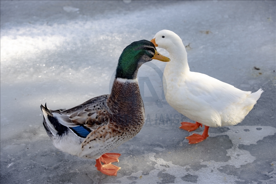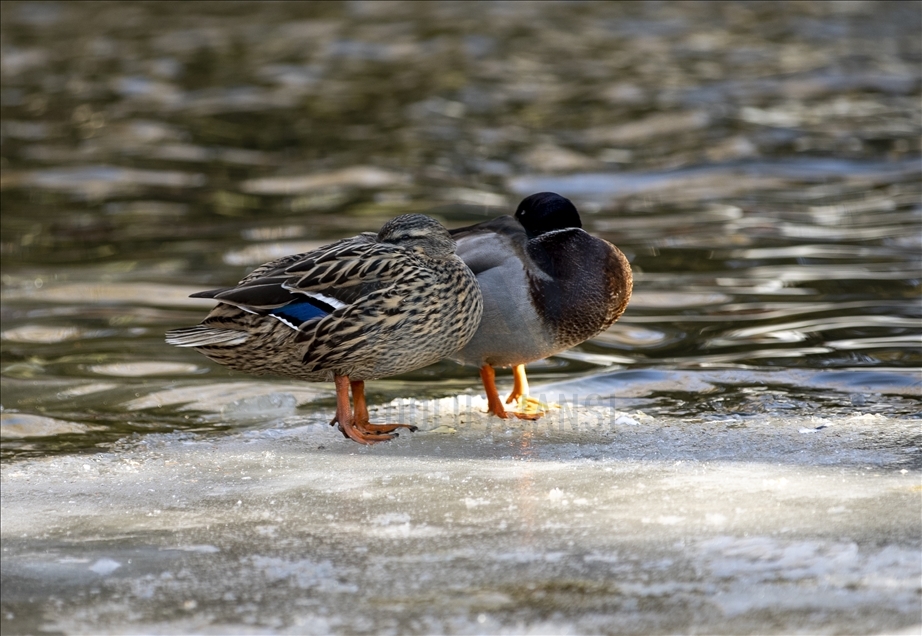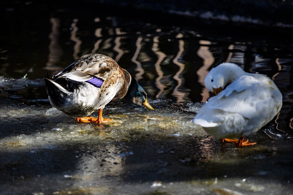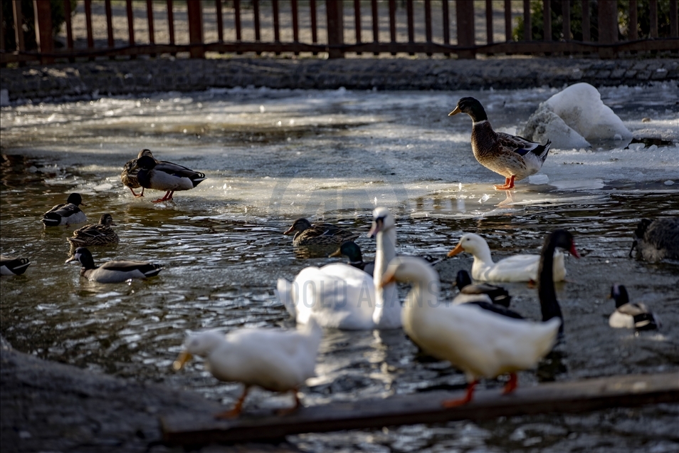 ANKARA, TURKEY - JANUARY 23: Ducks are seen on partially frozen Kugulu Park after air temperature dropped below zero during winter season in Ankara, Turkey on January 23, 2021. ( Aytaç Ünal - Anadolu Agency )Aytaç Ünal