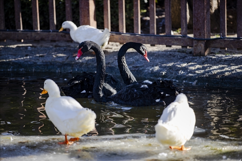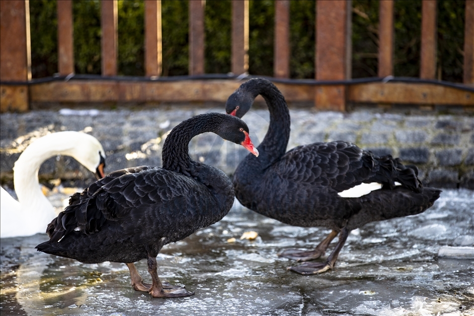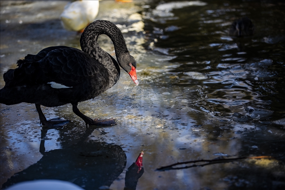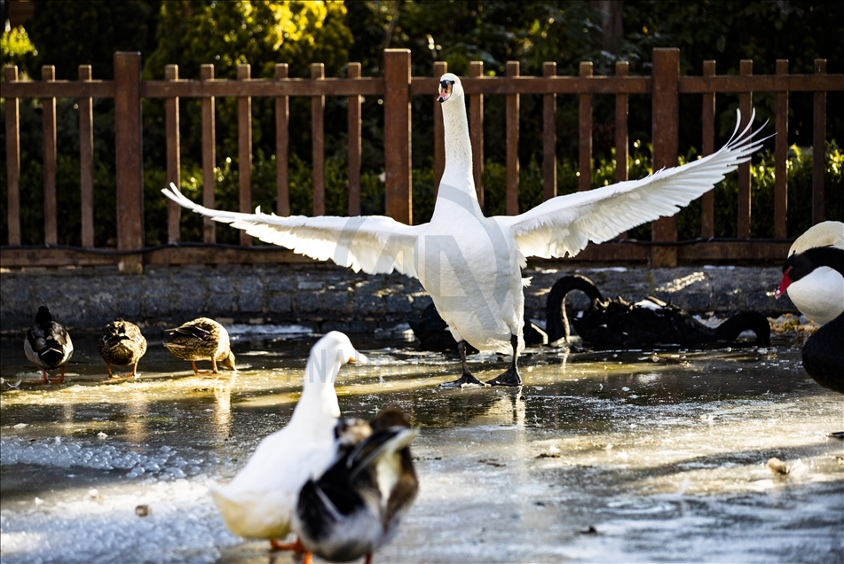 ANKARA, TURKEY - JANUARY 23: Swans and ducks are seen on frozen Kugulu Park after air temperature dropped below zero during winter season in Ankara, Turkey on January 23, 2021. ( Aytaç Ünal - Anadolu Agency )Aytaç Ünal