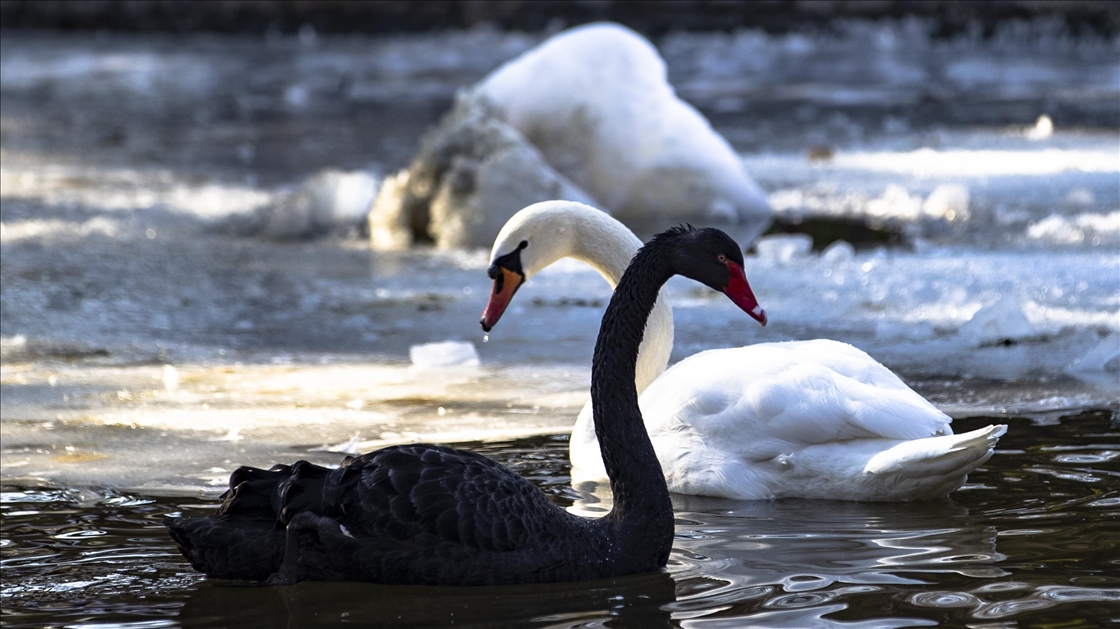 Swans swim at partially frozen Kugulu Park after air temperature dropped below zero during winter season in Ankara, Turkey on January 23, 2021.